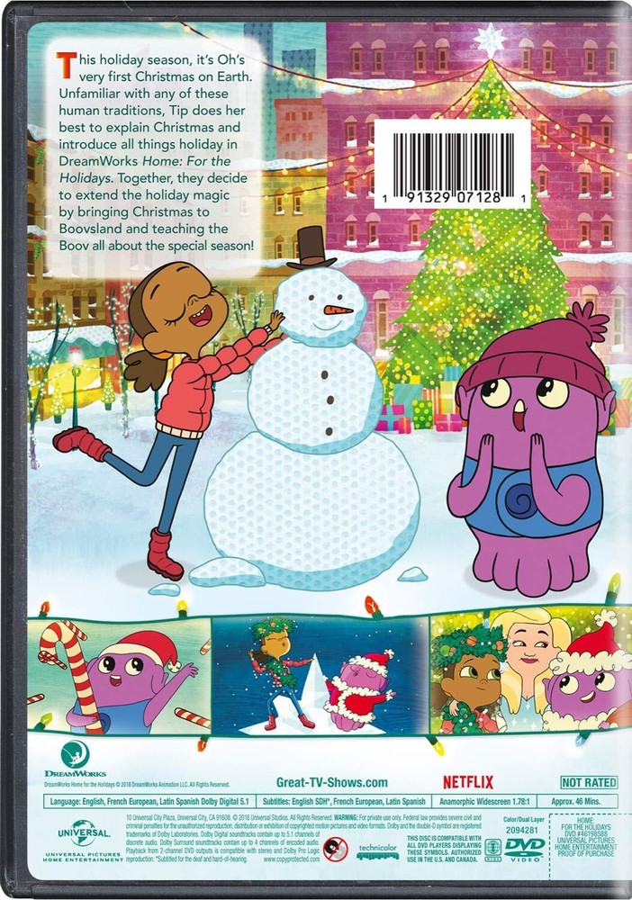 Further Details Title: Home for the Holidays Format: DVD Condition: New Number Of Discs: 1 Release Date: 10/02/2018 Actors: Rachel Crow, Mark Whitten, Kelly Clarkson, Will Fuller, Ron Funches Director: Blake Lemons Audio Language: English, Portuguese, French, Spanish Runtime: 46 minutes Region Code: DVD: 1 (US, Canada...) Studio: Universal Pictures Home Entertainment Subtitle Language: Spanish, French, English Certificate: MPAA Not Rated Description: This holiday season, it's Oh's very first Christmas on Earth. Unfamiliar with any of these human traditions, Tip does her best to explain Christmas and introduce all things holiday in DreamWorks Home: For the Holidays. Together, they decide to extend the holiday magic by bringing Christmas to Boovsland and teaching the Boov all about the special season! ]]> DVDs ARE REGION 1 UNLESS OTHERWISE STATED Missing Information? Please contact us if any details are missing and where possible we will add the information to our listing.