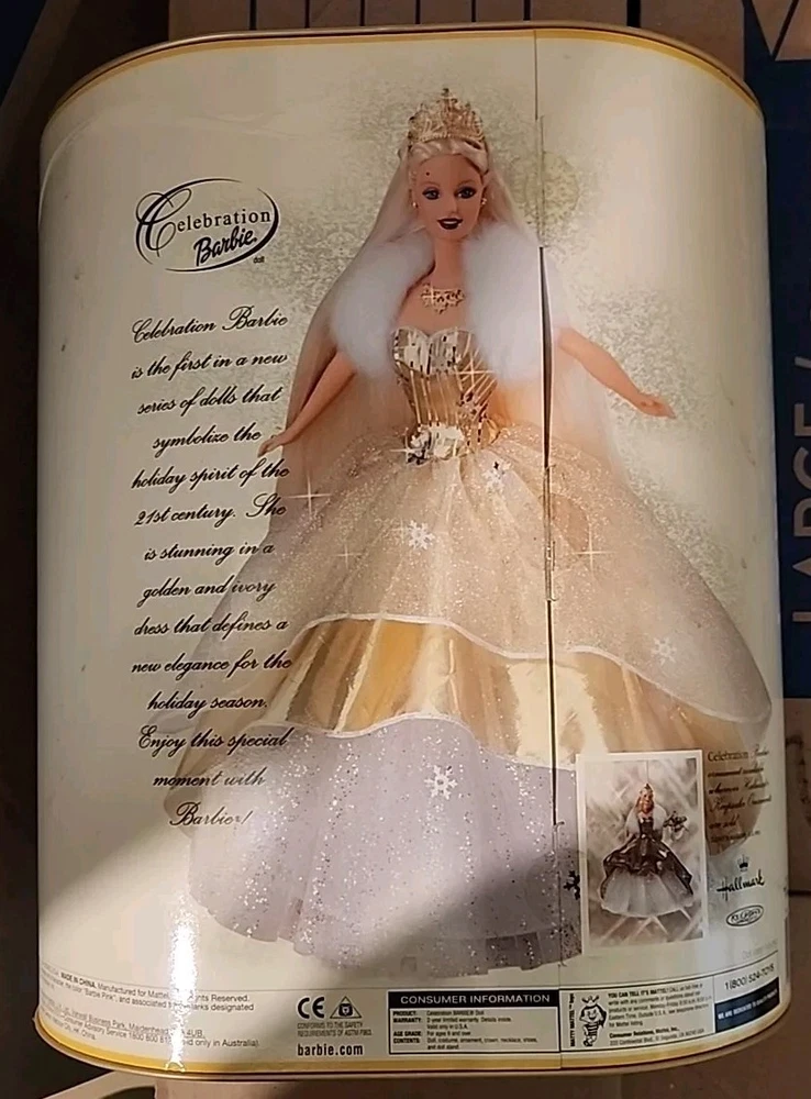 Doll Hair Type: Straight, Wavy Franchise: none Doll Gender: Girl Doll Material: Plastic, Vinyl, Fabric Theme: Celebrity Doll Eye Color: Blue Time Period Manufactured: 2000-2009 Doll Size: 12 in Features: Special Edition Vintage: Yes Doll Complexion: Light Character: Barbie Type: Fashion Doll Antique: No Occasion: Celebration Set Includes: Doll, Accessories, Outfit Brand: Mattel Year Manufactured: 2000 Doll Hair Color: Blonde Original/Licensed Reproduction: Original Product Line: Holiday Celebration Barbie