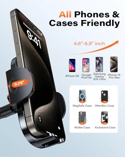 Return Policy Fast Delivery Trusted seller Cell Phone Holder for Car Dashboard Windshield Phone Mount for Car Long Arm Car Phone Holder Mount Strong Suction Cup Anti-Shake Stabilizer Compatible for iPhone, Samsung, All Smartphones Product Description Wide Compatibility and 100% Security: This phone holder for car, one size fit all, the expandable grips can extend up to 3.9 inch, which fit a variety of sizes cell phones, works great with bigger devices even with thick case on. Rubber Coated Grips for Increased Stability and Protection Reliable Strong Suction Cup: This suction cup phone mount use our proprietary suction technology features, suction cup with a coating of sticky gel for a longer lasting hold. This suction cup won't melt in the sun Ultra Stable As a Rock: This thicker long arm keeps your cell phone solid as a rock, with extra support arm stick on dash for stability. This window phone mount is not going to bounce or slip off. Strong windshield phone mount for car is a good choice for truck, car Works Great with Bigger Phones Even Thick Case On: Rubber Coated Grips for Increased Stability and Protection. The car mount is compatible with a 4.7-7" cellphone. For example, iPhone 16/15/14/13/12 Pro max, 16/15/14/13/12 Pro, 16/15/14/13/12, 16/15/14 Plus, 13/12 mini; Samsung Galaxy S24 Ultra, S24+, S24, S23 Ultra, S23+, S23, S23 FE, S22, S21, S10, S10+, S10e, Note 10; Google Pixel 8a, 8 Pro, 8, 7 Pro, 7, 7a, 6a, 6 Pro, 6; TCL 30, 30 V, 20 PRO, 20 A; Nexus 5 5X 6P, etc. All smartphones, although with the case Versatile Design and Easily Set Up: This cell phone car mount is fully adjustable with 360 Swivel tilt cradle grip, the arm is flexible for the most adjustability. Allows you adjust your phone to the best viewing angles. One quick-release button system, which allows you to place or remove your device with single button Shipping Returns Payment Shipping Shipping is FREE to all addresses other than APO/PO boxes in the lower 48 states. All our stock ships from US-based warehouses. Shipped via USPS or UPS (depending on location and package weight) Unless stated otherwise, all orders will ship within 24-72 hours of your payment being processed. Check our feedback to see the great reviews of FAST shipping we offer. Returns Seller does not accept returns Payment We currently accept payment via eBay managed payments only. Once payment is cleared, we will dispatch your shipment within 1-3 business days. Please refer to the "Shipping" tab for more information regarding shipping speed to your destination.