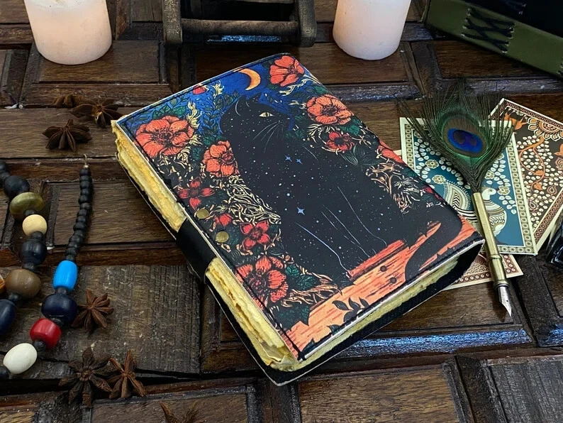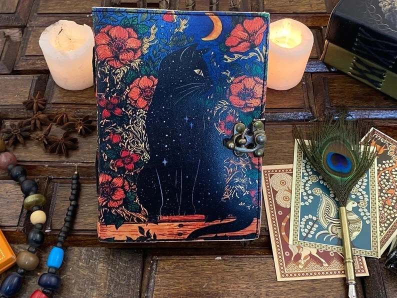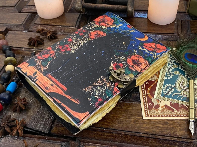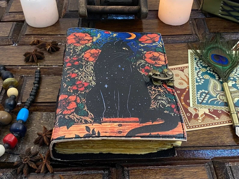 Introducing the enchanting Handmade Vintage Magic Cat Print Leather Journal Notebook, Handicrafts & Gifts. This exquisitely crafted journal is perfect for those who appreciate unique, vintage-inspired designs and the charm of handmade craftsmanship. Measuring 7x5 inches, this notebook is an ideal companion for writers, artists, and dreamers alike. The cover features a mesmerizing magic cat print that exudes an aura of mystique and allure, making it a perfect gift for cat lovers and magic enthusiasts. The rich, supple leather cover not only provides durability but also adds a touch of sophistication to your journaling experience. Inside, you'll find high-quality, handmade deckle-edged paper, adding to the journal's vintage charm. The paper is perfect for writing, sketching, and even scrapbooking, offering a versatile canvas for your creativity. Key Features: • Size - 7×5 inches,8 x 6 inches, 10x7 Inches 13x10 Inches • Color - • C-Lock • genuine leather • vintage deckle edge old paper • 100 Sheet (200 pages both side) Grimoire Celtic Cat Book of shadow Leather Journal Spell Book - Witch Wiccan Notebook Sketchbook Journal -Handmade Deckle Edge Paper Handmade Quality: Each journal is meticulously handcrafted by skilled artisans, ensuring a unique and high-quality product. Vintage Charm: The magic cat print and deckle-edged paper create a vintage look and feel, perfect for those who appreciate classic aesthetics. Durable Leather Cover: Made from high-quality leather, the cover is designed to withstand daily use while maintaining its elegant appearance. Portable Size: Measuring 7x5 inches, this journal is compact enough to carry with you everywhere, making it ideal for travel, work, or personal reflection. Versatile Use: The handmade deckle-edged paper is suitable for a variety of uses, including writing, drawing, journaling, and scrapbooking. Unique Design: The enchanting magic cat print adds a touch of whimsy and mystique, setting this journal apart from ordinary notebooks. Perfect Gift: An excellent choice for birthdays, holidays, or special occasions, this journal makes a thoughtful and unique gift for friends and loved ones. Embrace the magic of creativity with the Handmade Vintage Magic Cat Print Leather Journal Notebook $ Gifts. Whether you're capturing your thoughts, sketching your dreams, or documenting your adventures, this journal is the perfect companion for your creative journey