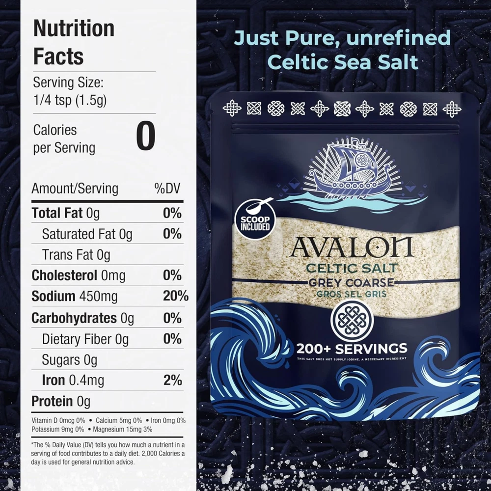 Avalon Celtic Salt, 8.0 OZ Coarse Celtic Sea Salt Organic, Unrefined French Celtic Salt Organic 82 Minerals Coarse, 100% Natural Gros Sel Gris, Sal Celtica Organica, Celtics Salt