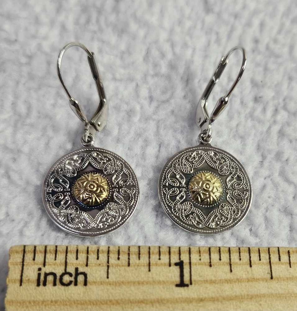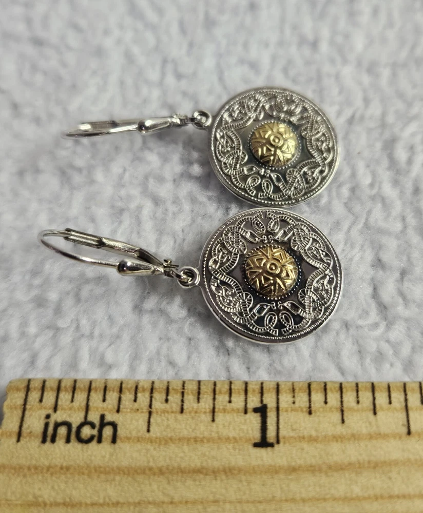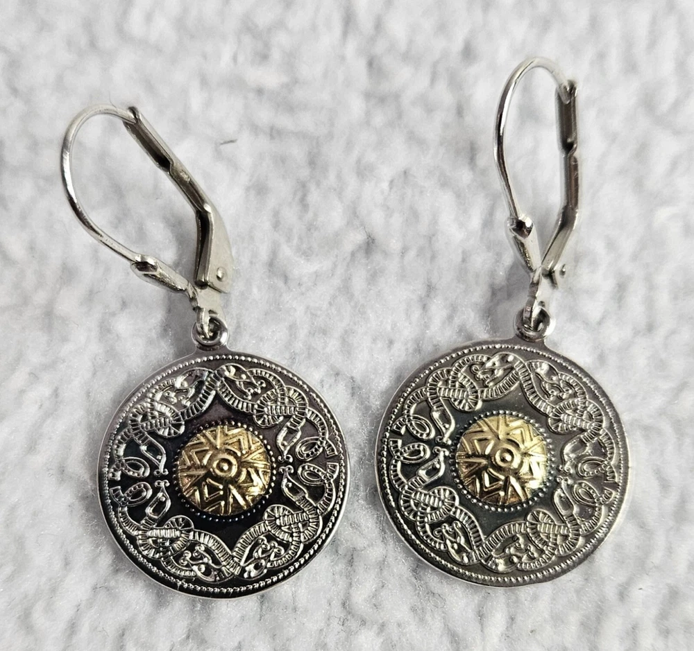 The silver is starting to get a little tarnished in the front, but other than that, the earrings are in excellent condition. Please check all the pictures for details. Add some Celtic charm to your jewelry collection with these beautiful Sterling Silver earrings. The intricate design of the Celtic Warrior Shield is handcrafted by skilled artisans in Ireland using premium quality materials. The earrings feature stunning 18K Bead accents that add a touch of elegance to the overall look. These earrings are perfect for anyone who appreciates fine craftsmanship and unique design. The silver metal and beaded accents create a timeless piece that can be worn with any outfit. Add these earrings to your collection today and enjoy a one-of-a-kind piece of jewelry.