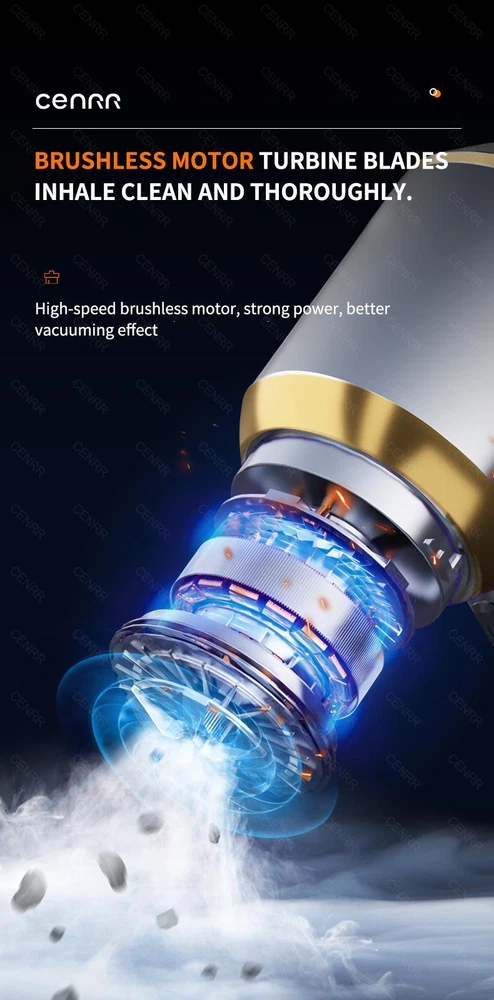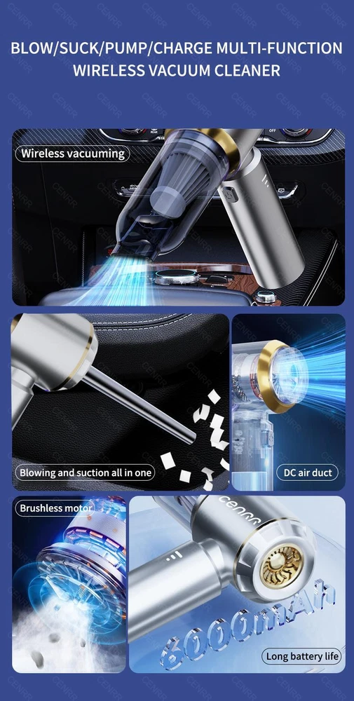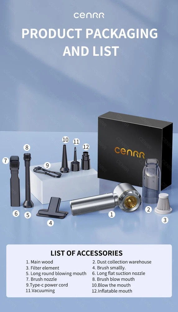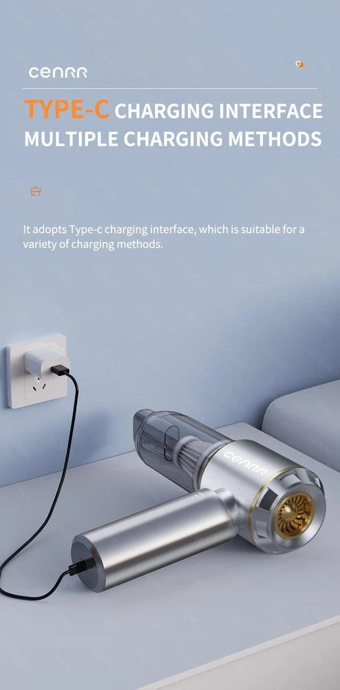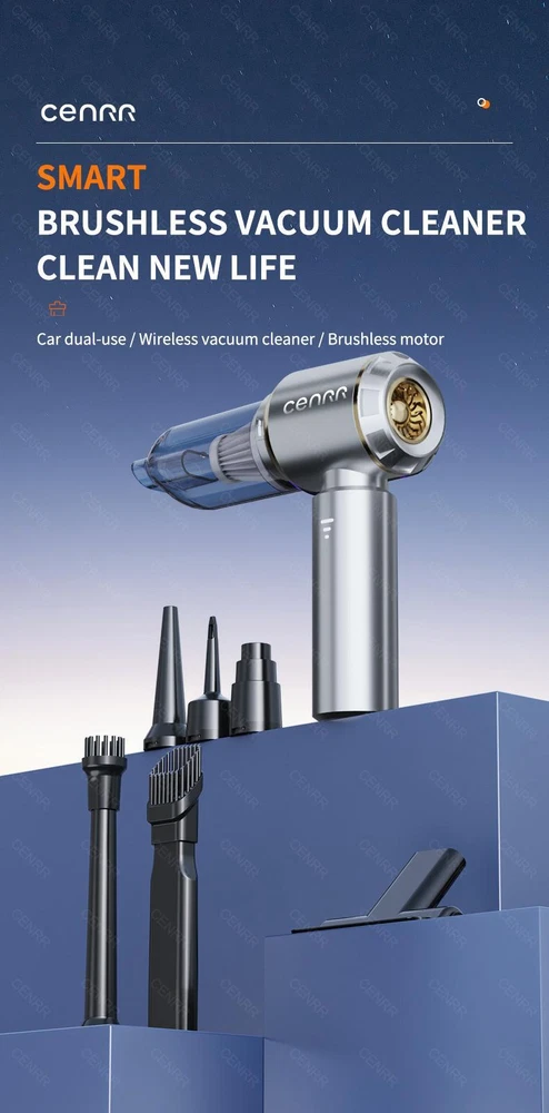 FREE SHIPPING 30 DAYS RETURN EASY PAYMENT Cenrr Mini Car Vacuum Cleaner - 360000pa Cordless, Handheld, Powerful Cleaner Introduction [Product Name]: Multifunctional Vehicle Vacuum Cleaner [Product functions]:mainly cleaning cars, vacuuming, blowing dust and so on [Package list]: vacuum cleaner X1 Accessories X 9 USB-C Charging line X 1 User manual X 1 [weight]:700g for MAX,720g for MAX 2hepa,830g for MAX 4hepa Version Introduction [Product material]: ABS [Motor]: New upgraded Brushless motor [Color]: Elegant Silver/Deep black [Vacuum degree]: 360000PA [Capacity of lithium battery]: 3 * 2000mAh [Rated speed]: 35500rpm [Charging mode]: Type-C charging line [Noise]: ≤ 32dB [Operating temperature]: - 20 ℃~+50 ℃ Thank you for shopping