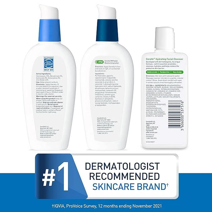 CeraVe AM Face Moisturizer with SPF, PM Face Moisturizer & Hydrating Face Wash Skin Care Routine for Morning & Night | Travel Size Toiletries | 3oz Lotion + 3oz Lotion + 3oz Cleanser OIL FREE DAY CREAM & NIGHT CREAM & HYDRATING FACE WASH FOR TRAVEL ] Contains a full size 3oz CeraVe AM Facial Moisturizing Lotion with SPF 30, a full size 3oz CeraVe PM Facial Moisturizing Lotion, and a 3oz CeraVe Hydrating Facial Cleanser [ SUNSCREEN & NIGHT CREAM WITH HYALURONIC ACID & NIACINAMIDE ] Cerave AM & PM face cream contains niacinamide to help calm the skin & hyaluronic acid to help retain skin's moisture. They use MVE Technology to deliver hydration throughout the day & night [ DAILY FACE WASH ] Gentle cleansing lotion with hyaluronic acid, ceramides, and glycerin to help hydrate skin without stripping moisture. Removes face makeup, dirt, and excess oil, provides 24-hour hydration and leaves a moisturized, non-greasy feel [ 3 ESSENTIAL CERAMIDES ] Ceramides are found naturally in the skin and make up 50% of the lipids in the skin barrier. All CeraVe products, formulated with three essential ceramides (1, 3, 6-II)to help maintain the skin’s natural barrier. [ DEVELOPED WITH DERMATOLOGISTS ] CeraVe Skincare is developed with dermatologists and has products suitable for dry skin, sensitive skin, oily skin, acne-prone, and more.