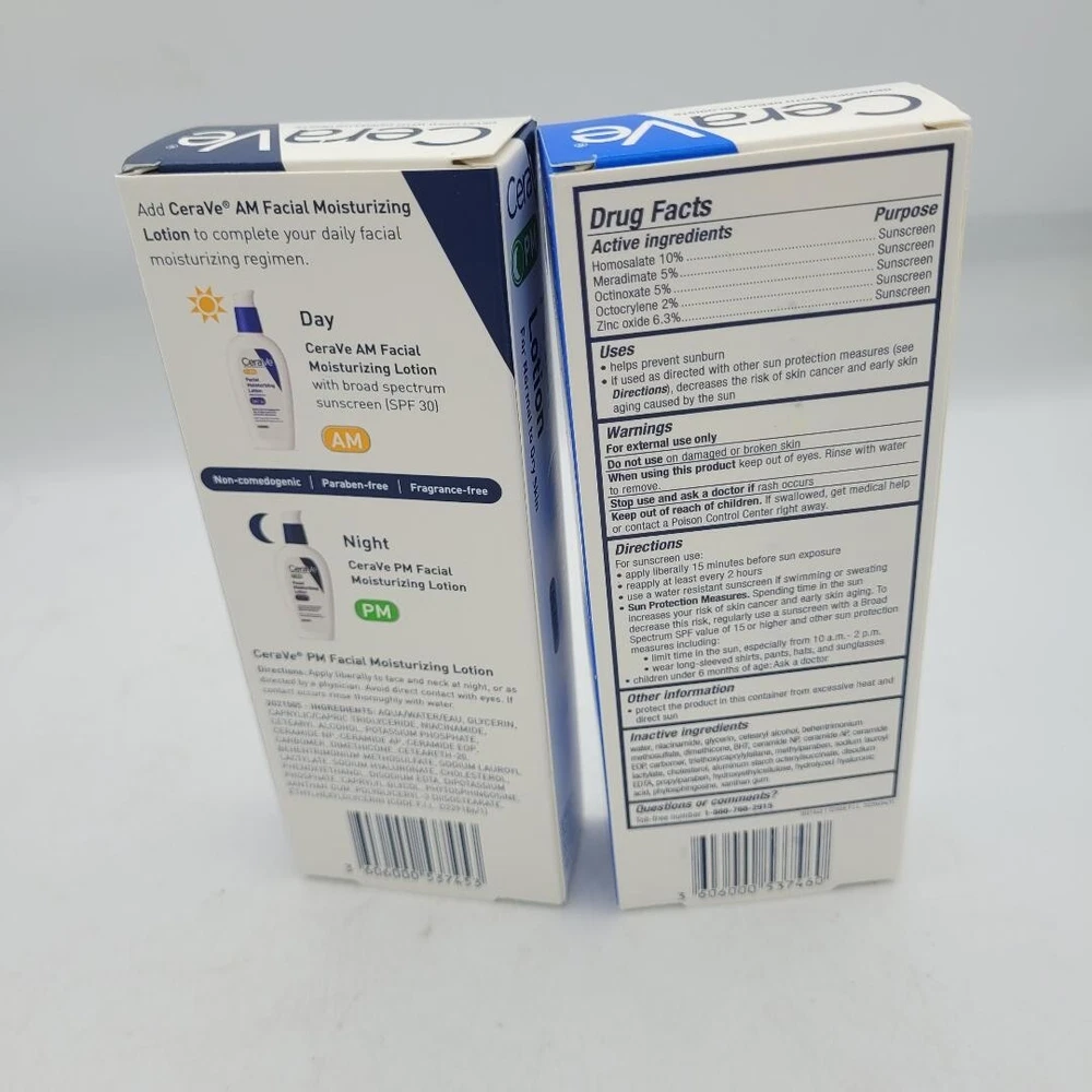 Is Expiration Dated Product:trueItem Name:CeraVe Day & Night Face Lotion Skin Care Set | Contains AM..Model Number:VAL36603/703Street Date:2015-06-17T00:00:01ZMaterial Type Free:Fragrance FreeRecommended Uses For Product:MoisturizingItem Volume:3.0Scent:UnscentedDirections:Lotion AM: Apply liberally to face and neck after cleansin..Body Area:Facegtin13:791617274457Model Name:Day & Night Face Lotion Skin Care Set | Contains AM with S..Target Gender:unisexIngredients:Lotion AM: » ALUMINUM STARCH OCTENYLSUCCINATE» BEHENTRIMON..Brand:CeravePackage Level:unitImport Designation:Made in USContains Liquid Contents:trueSun Protection:30.0Skin Type:AllMPN:EW-2827Target Use Body Part:faceMaterial Feature:NaturalAge Range Description:AdultSun Protection Factor (SPF):SPF 30Item Type Keyword:facial-moisturizersSpecific Uses For Product:DrynessFc Shelf Life:730.0Product Benefit:HydratingProduct Expiration Type:Expiration On PackageSize:RegularSpecial Ingredients:Hyaluronic AcidSpecial Feature:Not-ApplicableType:Does not applyCustomer Package Type:Standard PackagingItem Form:LotionSupplier Declared Dg Hz Regulation:not_applicableItem Package Quantity:2Number Of Items:2Style:AM & PM Lotion BundleFormulation:LotionUPC:791617274457Product Site Launch Date:2011-03-25T16:52:57.018Z