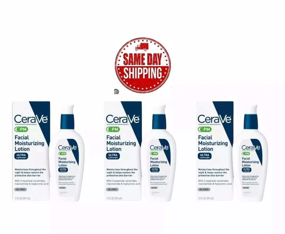 CeraVe Face Moisturizer with Sunscreen, AM Facial Moisturizing Lotion for Normal to Dry Skin - SPF 30 Original. BROAD SPECTRUM SPF 30 ] A micro-fine zinc oxide sunscreen for UVA/UVB protection. This CeraVe moisturizer with SPF is a hydrating facial lotion that spreads easily, is absorbed quickly, and leaves a non-greasy finish OIL FREE DAY CREAM ] Use this daily face sunscreen as the last step in a morning skincare routine. If layering with an eye cream, moisturizer or facial serum, apply Cerave AM facial lotion after other product applications have been fully absorbed SUNSCREEN WITH NIACINAMIDE ] Contains Hyaluronic Acid to retain skin's moisture and Niacinamide to help calm skin. MVE Technology delivers hydration throughout the day ESSENTIAL CERAMIDES ] Ceramides are found naturally in the skin and make up 50% of the lipids in the skin barrier. All CeraVe products are formulated with three essential ceramides (1, 3, 6-II) to help restore and maintain the skin’s natural barrier GENTLE ON SKIN ] Recommended for daily use by the Skin Cancer Foundation. Fragrance free, oil free, non-comedogenic, paraben-free. Suitable for dry skin, sensitive skin, oily skin, and acne-prone skin CeraVe Facial Moisturizing Lotion PM Ultra Lightweight 3 oz Original. OIL FREE NIGHT LOTION ] Use Cerave PM facial lotion as the last step in an evening skincare routine. If layering with an eye cream, moisturizer or facial serum, apply the Cerave night lotion after other product applications have been fully absorbed OVERNIGHT MOISTURIZER ] Cerave’s PM face cream contains niacinamide to help calm the skin and uses MVE Technology to deliver hydration throughout the night. It also contains hyaluronic acid to help retain skin's moisture GENTLE ON SKIN ] Fragrance free, paraben-free, oil free, non-comedogenic, and allergy-tested 3 ESSENTIAL CERAMIDES ] Ceramides are found naturally in the skin and make up 50% of the lipids in the skin barrier. All CeraVe products are formulated with three essential ceramides (1, 3, 6-II) to help restore and maintain the skin’s natural barrier DEVELOPED WITH DERMATOLOGISTS ] CeraVe Skincare is developed with dermatologists and has products suitable for dry skin, sensitive skin, oily skin, acne-prone, and more. PM FACIAL MOISTURIZER] With Niacinamide moisturizes throughout the night & helps restore the protective skin barrier HYALURONIC ACID] Helps retain skin's moisture PATENTED TECHNOLOGY] Utilizes patented MVE controlled-release technology to help deliver long-lasting moisturization