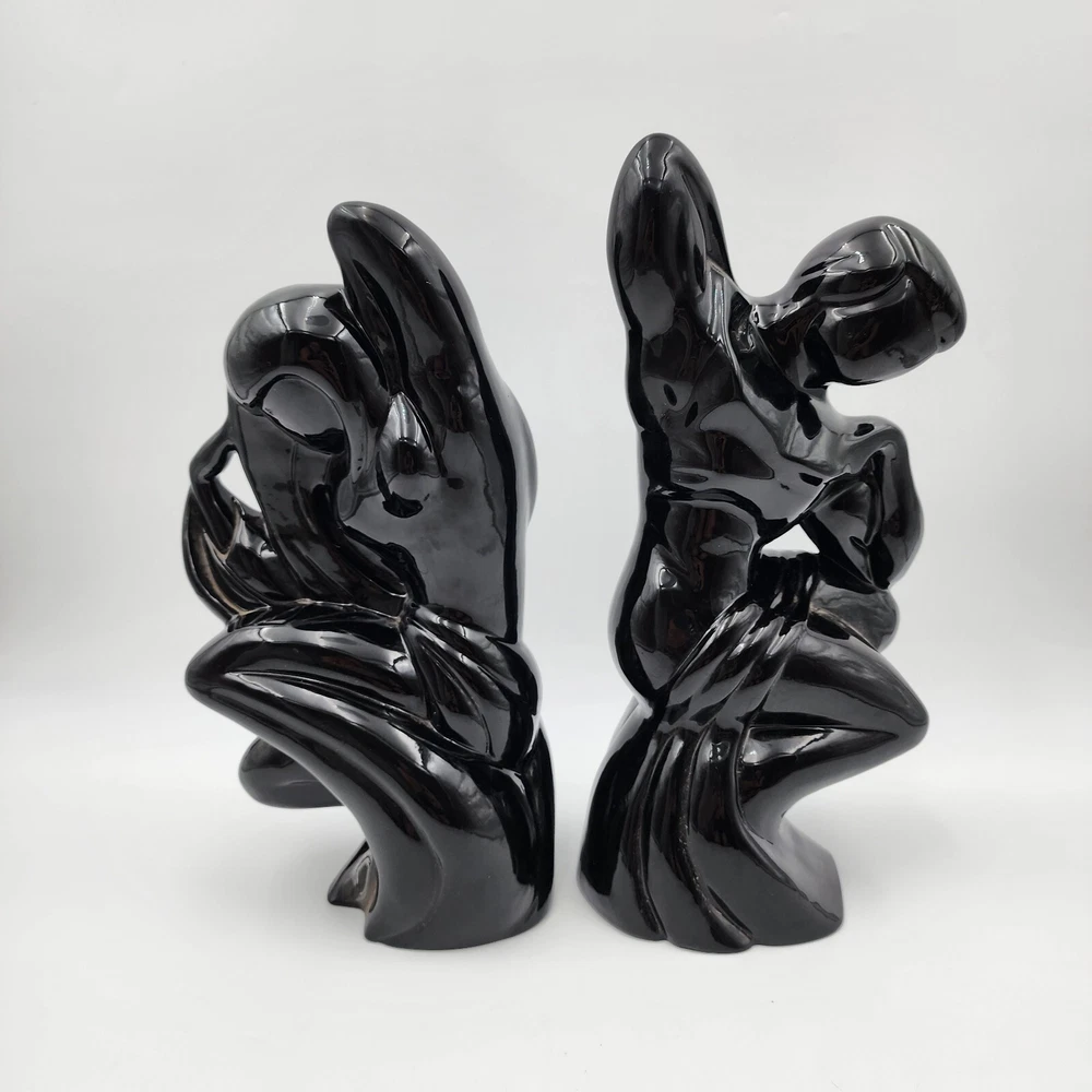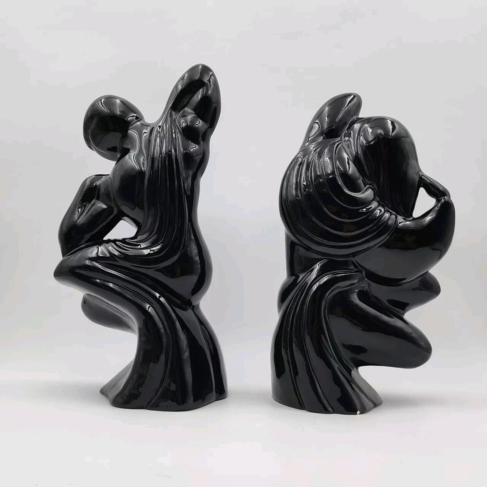 These all black, high-gloss ceramic figural statues are examples of mid-century modern art. They represent a man and a woman, each with their arm raised behind their heads holding a draped cloth. These figures are sculpted in the round so that the draped cloth covers their nudity and can be seen. The use of lines to create ribbon or curtain patterns is indicative of the Art Deco style. These figures are substantial, each measuring 16." in height. The male figure measures 8"Lx5"Wx16.5"H, and the female figure measures 7"Lx6"Wx16"H. This pair would be ideal display pieces in a home or office setting.