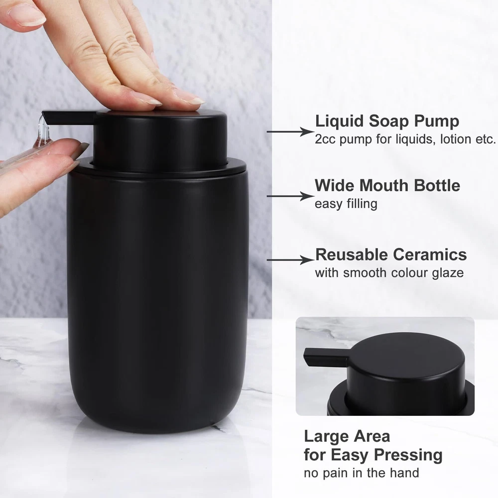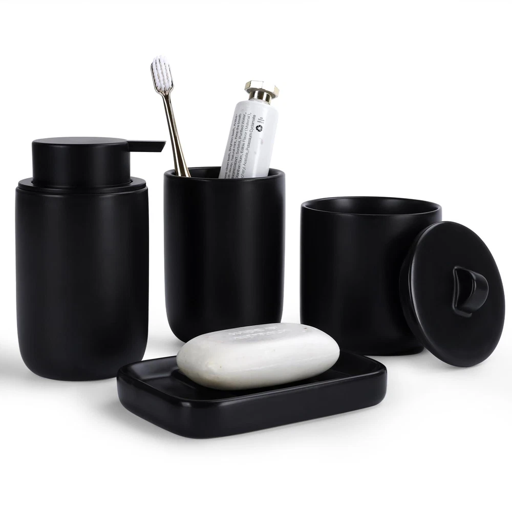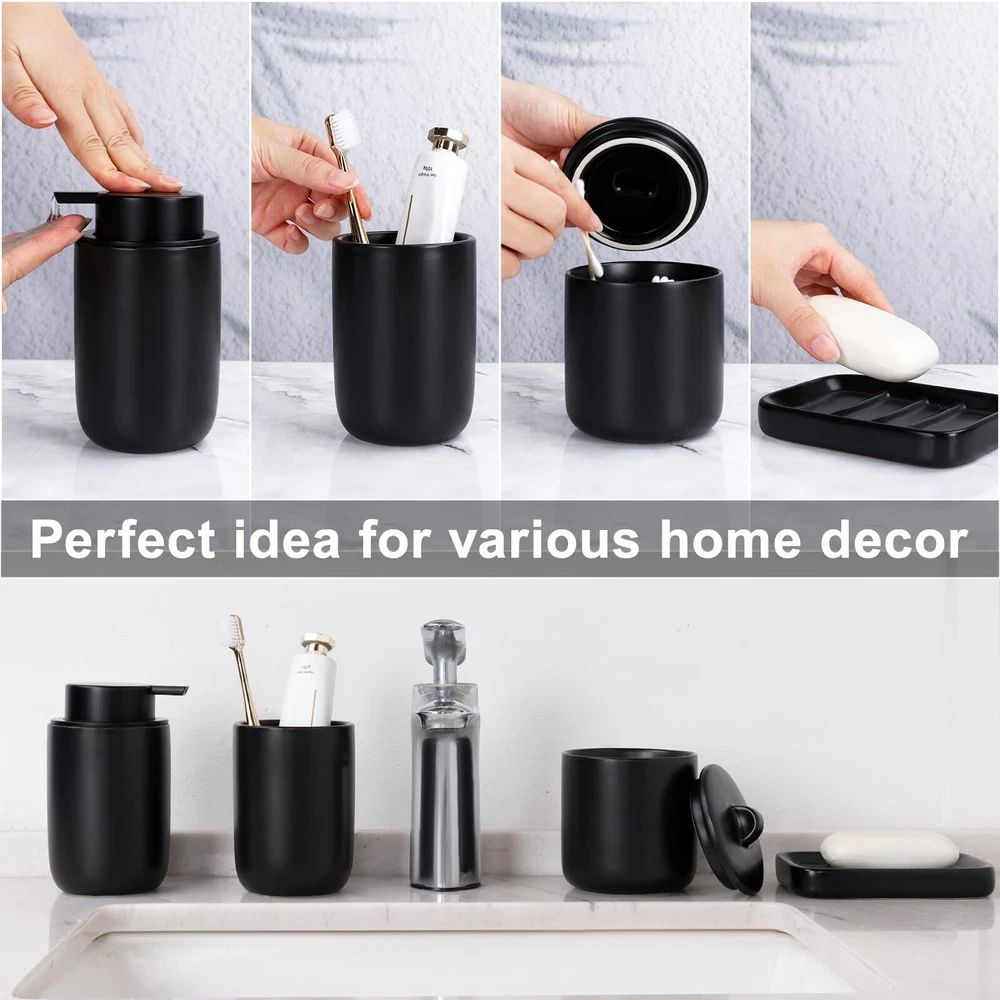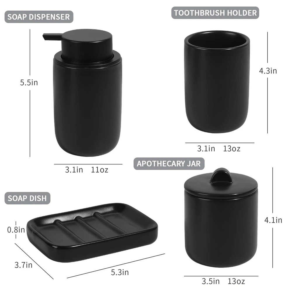 Are you looking to add a touch of sophistication to your bathroom? Look no further! Our Ceramic Bathroom Accessories Set of 4 is designed to transform your bathroom into a stylish oasis. 1. 11 oz regular wide mouth soap dispenser is perfect for liquid hand soap,dish soap, lotion, aromatherapy essential oil blends, shampoo, body wash, mouthwash, hand sanitizer, massage oils etc. 2. Includes durable BPA-free plastic pump, preventing rust and corrosion for longevity. 3. Not to be used as a Foaming Hand Soap Dispenser or with any Foaming Soap. 4. Fits many decors, from farmhouse to industrial. Great for the kitchen and bathroom. Black Bathroom Accessory Set: 4 pcs farmhouse rustic decor ceramic bathroom set, perfect for any bathroom vanities or kitchen sink. Our complete bathroom sets crafted from premium ceramic with a smooth finish, both sturdy and easy to clean Liquid Soap Dispenser: This is a 11 oz wide mouth hand soap dispenser that very easy to fill. With a big foam pump which has a wide press area for easy pressing. The liquid soap dispenser is perfect for liquid soap, dish soap, hand sanitizer, etc Decorative Qtip Holder: This wide mouth Apothecary jar Cotton Swab jar is easy to access the items inside. The qtip holder are great for cotton swabs, q-tips, cotton balls, cotton pads, floss, hair bands or any other bathroom necessities Toothbrush Holder/Tumbler: The toothbrush holder is simple and compact, fit most toothbrushes and your toothpaste, razor, makeup brushes, pens, pencils and more. Bathroom toothbrush holder set can also be used as a tumbler : Black bathroom sets accessories are perfect for weddings, housewarmings, birthdays, and baby shower. If you are not completely satisfied, just let me know, we will provide a satisfied solution to you