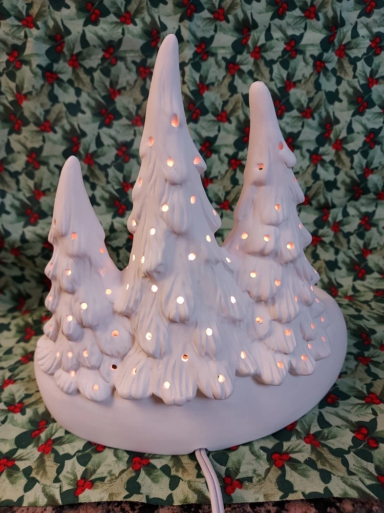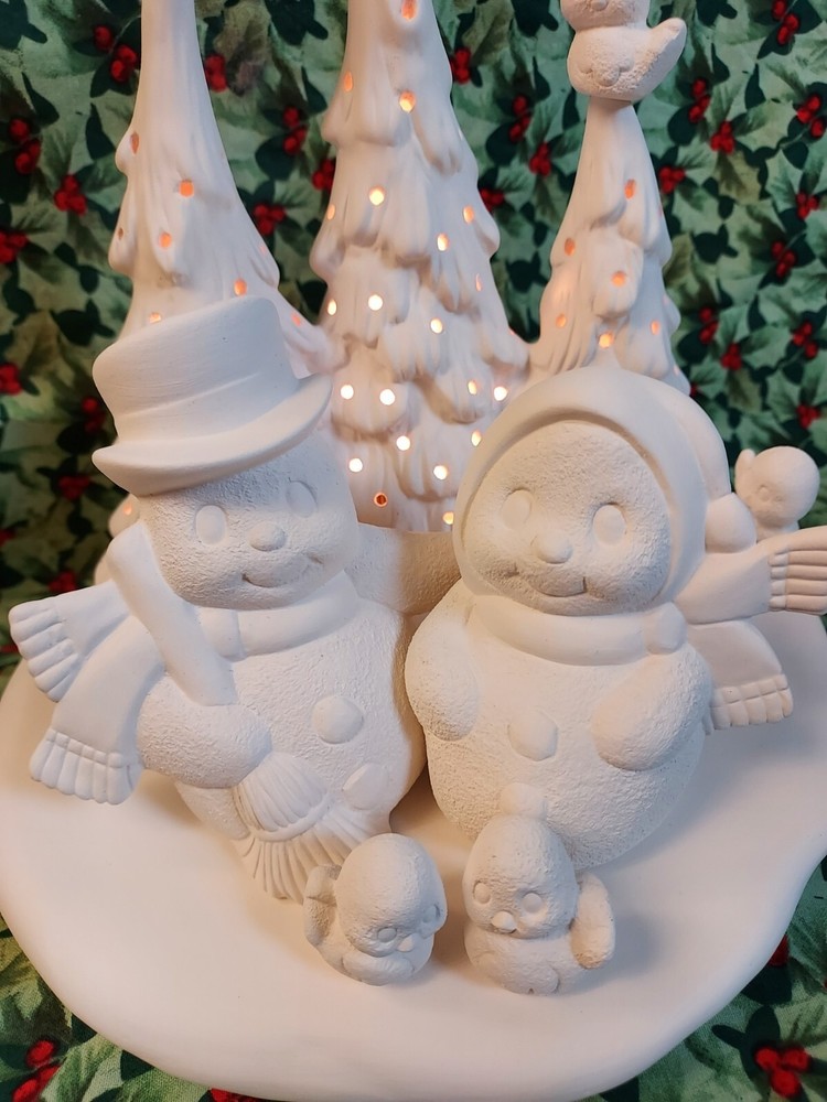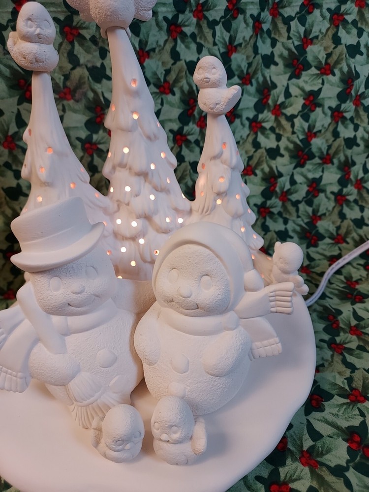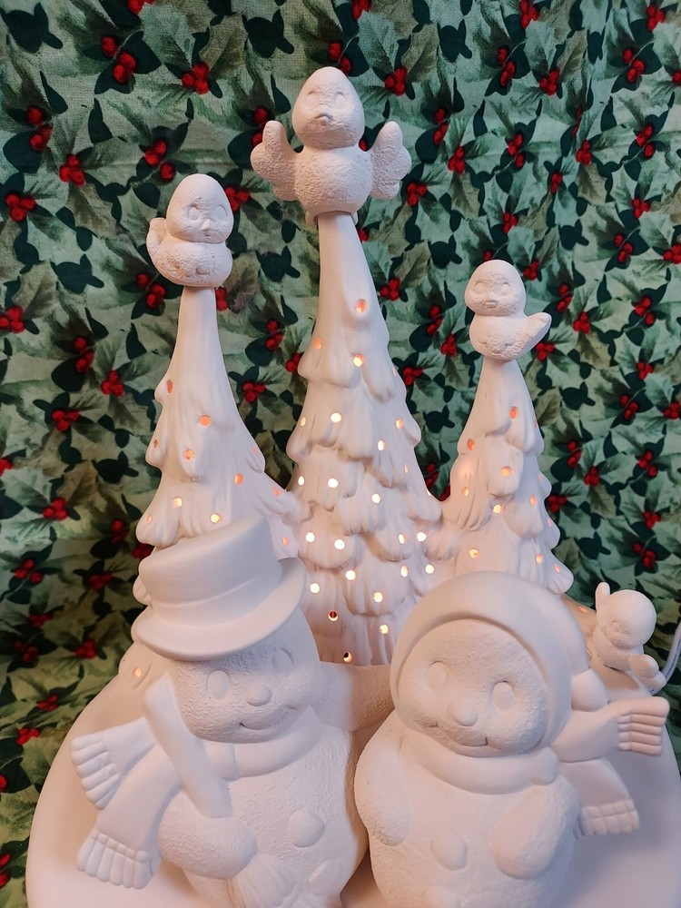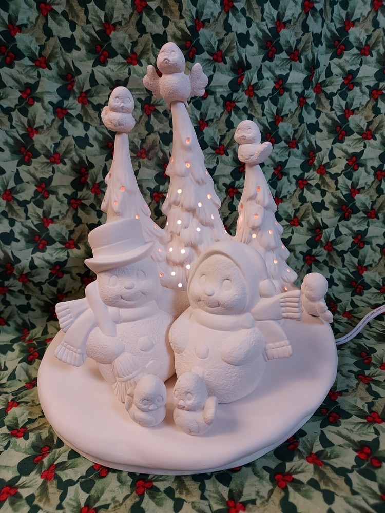 PLEASE CHECK ESTIMATED DELIVERY DATES BEFORE PURCHASING ITEM. T he following pictures may be in color but you are purchasing UNPAINTED, ceramic bisque. The unpainted ceramic bisque will be fired to cone 04 and is ready to be painted by you. This is a purchase for a ready to paint ceramic bisque Snow couple with lighted trees scene. Look at those adorable snow birds! This is a brand new addition to my store and will be fired to a cone 04. The measurements are: base- 8" tall, snow couple are 4" tall, birds are approximately1" tall. I do include a clip in light and mini pin lights for this purchase. Your children or grandchildren will love seeing this displayed year after year. What a nice family heirloom to make to enjoy for many years to come. I also have the ice skating bunnies scene. MOLD LOCATIONS: O3-2894 tree base J1-2648 snow couple birds