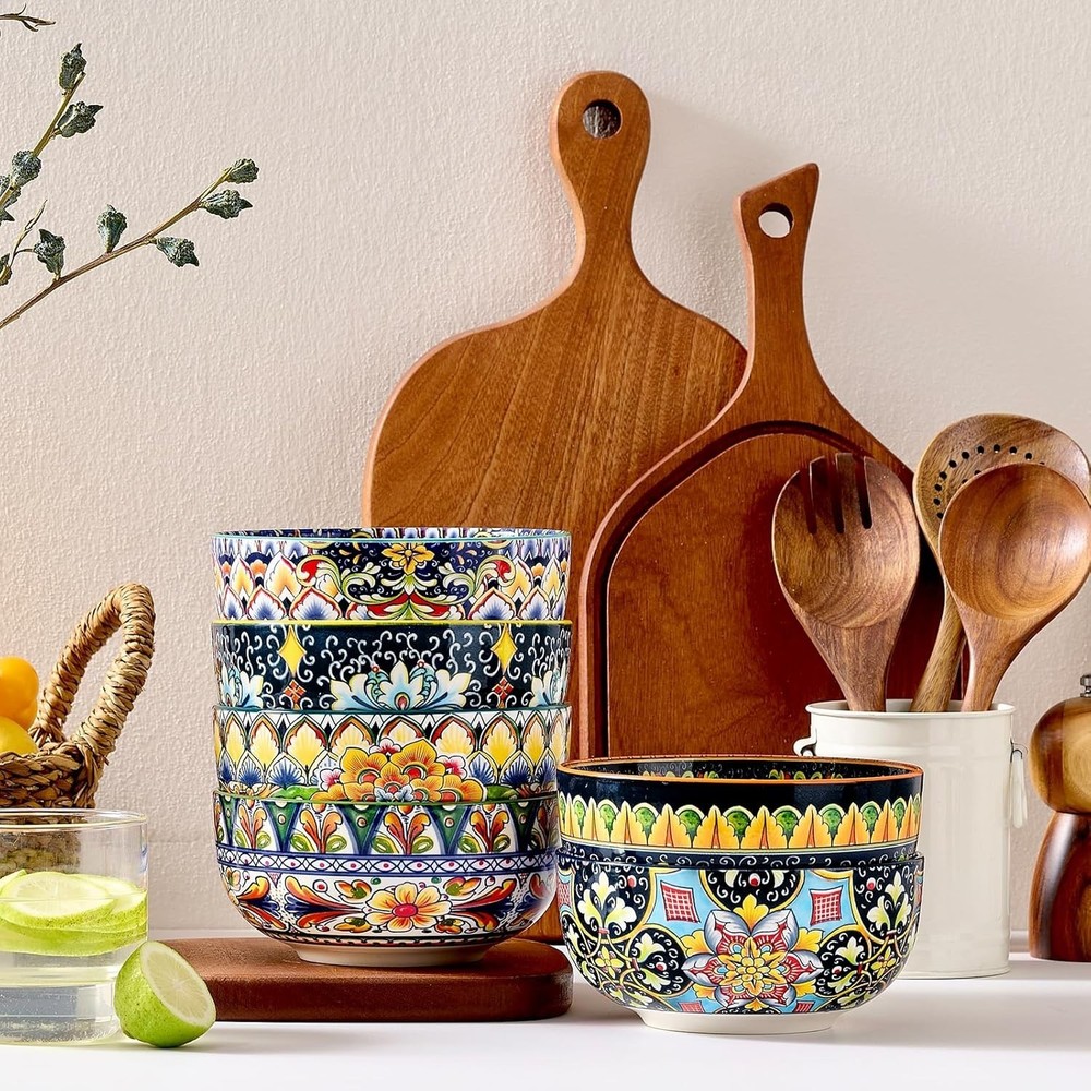 Ceramic Cereal Bowls Set of 6, 28 Oz Bohemian Soup Bowl, Colorful Bowls Set for