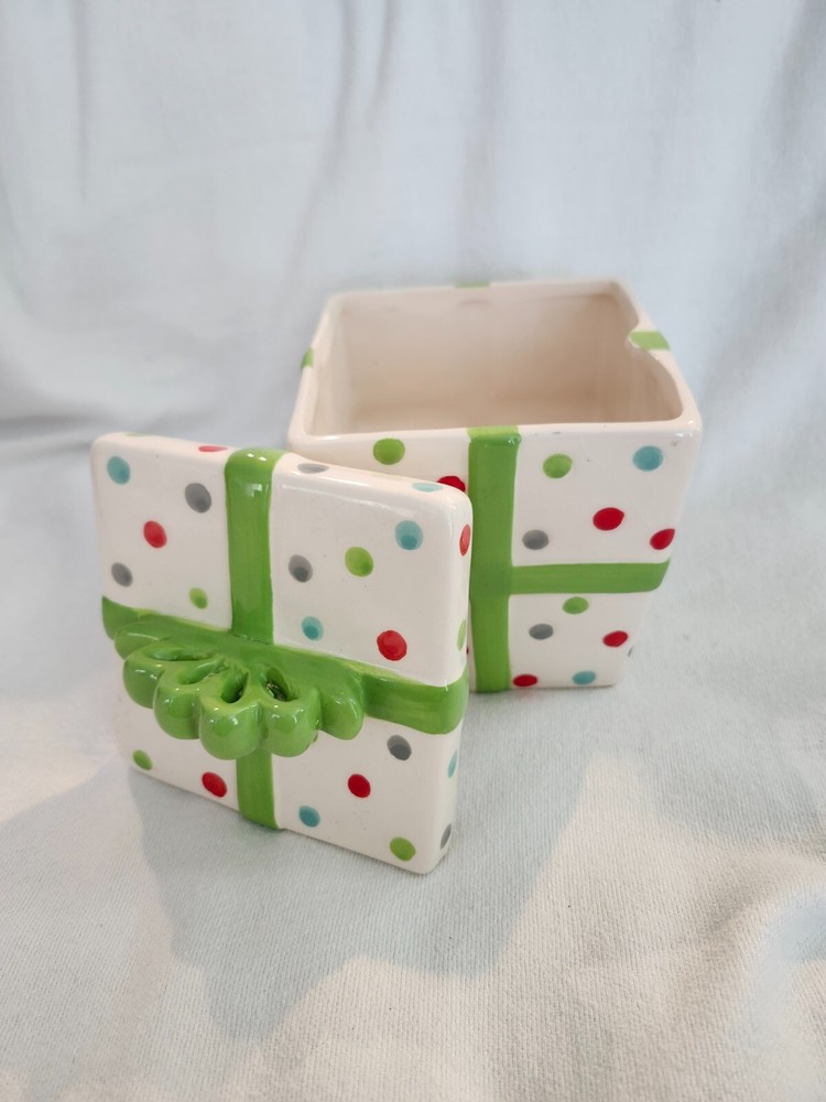 BEATIFUL GIFT BOX, TRINKET BOX, OR JUST DECO. PRE- OWNED, CHRISTMAS COLORS, POLKADOTS . 0RIGINALLY, A FLORAL BOX. THERE IS SOME CRAZING ON IT.