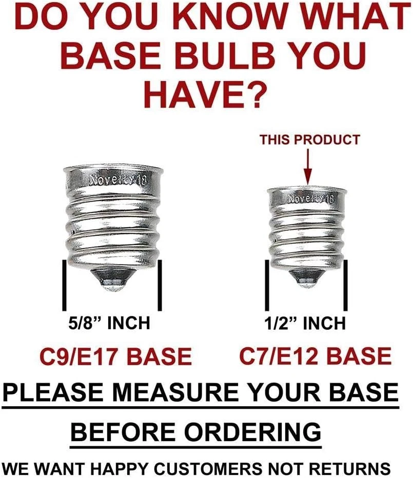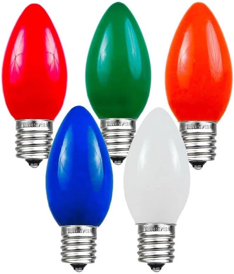 VERSATILE USE: These powerful and durable bulbs are just what you need for wedding decor, Christmas celebrations, weekend BBQ's and so much more! Spruce up your patio with these classic party lights that will be sure to brighten up your space! MULTIPLE POWER SETTINGS: Our glass-made dimmable replacement bulb will illuminate all indoor/outdoor space. Spice up your lighting and scenery to set the mood. From wedding decorations to bedroom essentials, these lights will illuminate your needs! APPLICATION: Screw in these replacement bulbs to unlock their brightness! Create the best mood for a variety of events and celebrations by illuminating your outdoor space with an elegant warm ambiance. DIMENSIONS & DETAILS: These nickel coated E12 Base 5 Watt 130 Volt bulbs are 2-1/4" tall by 1" wide and fully dimmable. With the 3,000 hour lifespan and adjustable brightness, you can create customized ambient lighting for all your events! OUR MISSION: At Novelty Lights, we pride ourselves in being string light experts, bringing you high quality LED Christmas lights, fairy lights, outdoor string lights, twinkling lights, replacement bulbs, and more at budget-friendly prices. Product Description C7 Replacement Christmas Light Bulbs Traditional Retro Bulbs Our 25-Pack of C7 ceramic replacement lamps are perfect for decoration of your house or business for the Christmas season. Our C7 bulbs have a candelabra base (e12) and measure 2-1/4" tall and 1" wide. Stringers Sold Separately Use with our C7 Stringers, Heavy Duty Candelabra (e12) Stringers, Vintage e12 Twisted Wire Strings with Bakelight Sockets or bulk C7 spools for all your Christmas lighting applications. Applications Use our traditional C7 ceramic opaque replacement bulbs for your decorations needs. Some applications include: Christmas, roofline string lighting, weddings, restaurants, patio, special event tents, Christmas trees, and more. C7 Replacement Bulb Specifications 25 Bulbs 3000 Hour Bulb Life 5 Watt 120 Volt C7/E12 Candelabra Base Nickel Coated Base Bulb Size: 2-1/4" Tall by 1" Wide Roofline Decoration Christmas Tree Decoration Traditional Christmas Bulbs C7 Bulb Measurements