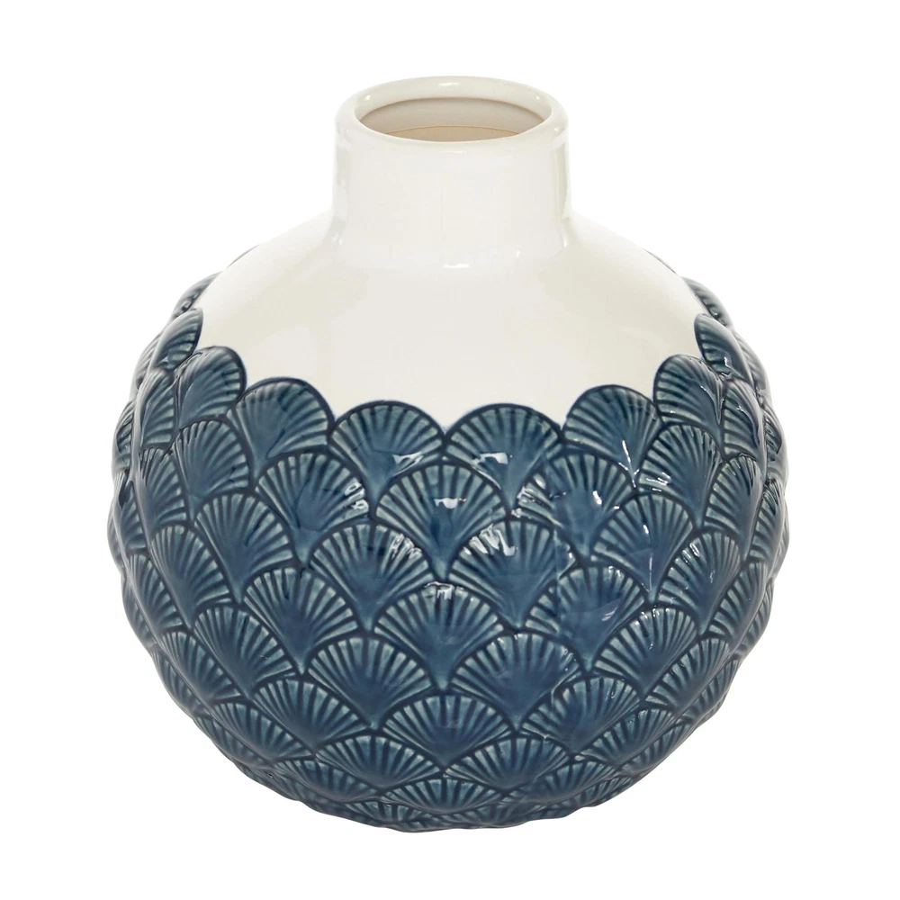 Each coastal vase for home decor is molded from stoneware, showcasing the beauty of its materials. The polished blue vase for flowers is round with shell patterns. Wipe clean with a dry cloth. The blue centerpiece vase is perfect for adding a coastal touch to any room, whether it's the living room or bathroom. Designed with felt or rubber stoppers at the base that prevent scratching furniture and table tops, as well as sliding around. This item ships in 1 carton. Suitable for indoor use only. This item ships fully assembled in piece. This is a single blue colored vase. Coastal style. Vase has a 3 in mouth opening. COASTAL HOME DÉCOR VASE: Inspired by blissful and the allure of the sea, where soothing hues and natural textures bring effortless charm to the home CERAMIC VASE FOR CENTERPIECE: This blue decorative vase is made from high-quality stoneware BLUE AND WHITE VASE FOR FLOWERS: The round home decor vase features a polished blue and white finish with intricate shell designs ROUND VASE FOR HOME DÉCOR: The stoneware vase boasts detailed craftsmanship and a glossy surface, perfect for adding a coastal and elegant touch to your decor SMALL SIZE FLOWER VASE CENTERPIECE: The blue ceramic vase measures 8.4L x 8.4W x 8.6H inches, and weighs 2.79 lbs