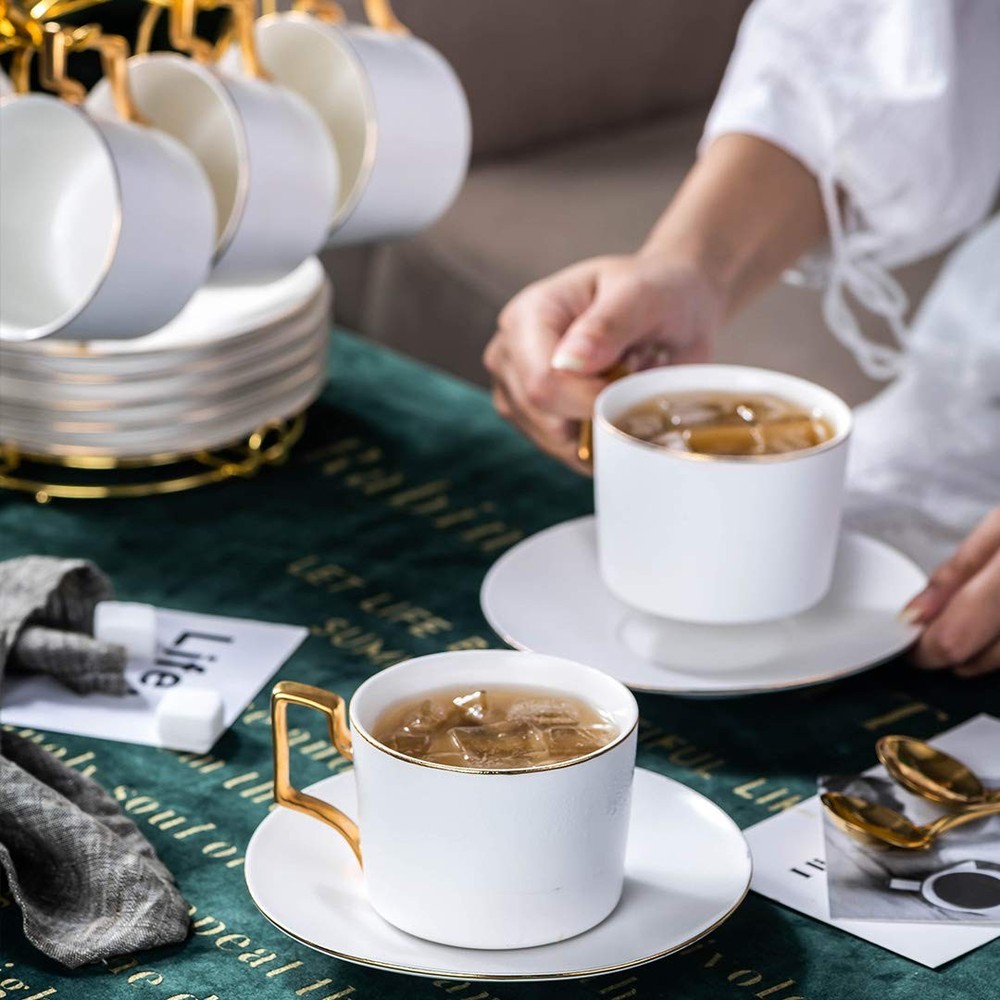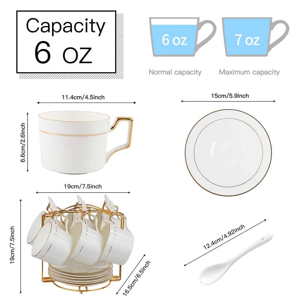 Enjoy your life, Enjoy your tea or coffee time with our Yelife tea cups and saucers! Enjoy an elegant afternoon! Using tea cups and saucers, just like drinking the delicious coffee in a high-end coffee shop. Tea cup and saucer set are decorated with glossy gold trim and a delicate dessert, perfect choice for your afternoon tea time.With Yelife Tea Cup and Saucer Set, it can improve quality of life of individuals, and you can enjoy the natural atmosphere of relaxed elegance. Housewarming Gift What a great and thoughtful gift for friends' birthday, Christmas, Thanksgiving Day and other memorable days. They will be so impressed by your sincere wishes and kind thoughts. Easy to wash. It can be cleaned easily under running water. Not contain lead and other harmful to the human body. Specifications: Material: High Grade Porcelain Colour: white Cup diameter:3.2 inch Cup high: 2.56 inch Saucers diameter: 6 inch Spoons diameter: 5.11 inch Package Included(19pcs): 6 * espresso cups 6 * espresso saucers 6 * spoons 1* cups rack Note: Due to the hand measurement, there have size error about 1 -2mm. If you have any questions about the product, please feel free to contact us, we will help you solve it as soon as possible. Thanks! 【ELEGANT DESIGN】coffee cup and saucer set with matte design style, gold trim design makes your morning brighter and more elegant! Perfectly matching your home decor style, the high-end and elegant mugs are sure to give your guests an unforgettable dining experience. 【HIGH GRADE PORCELAIN】The cappuccino cups with saucers are crafted with high premium approved porcelain. Note that this cup and saucer cannot be used in the microwave. 【PRACTICAL AND CONVENIENT】With comfortable cup handle, your finger can easily go through it, convenient to hold. Raised rim saucer with round center indentation easily to hold your coffee cup, coffee spoon, sugar or milk packet. 【MULTI-USAGE】The coffee cup and saucer set are perfect for cappuccino, espresso, macchiato, caffe latte, demitasse, tea and coffee. Enjoy your espresso in this fun and timelessly fashionable design demitasse cups set. 【ELEGANT GIFT】The Tea cup and saucer was safely packaged. It is a decent gift for your friends and family on Housewarming, Wedding party, Mothers' Day, Fathers' Day, Christmas and New Year's Day.