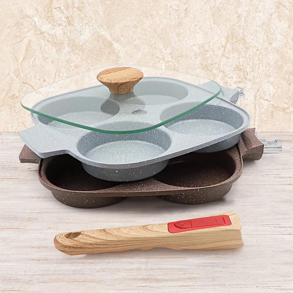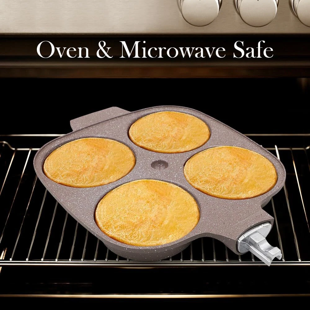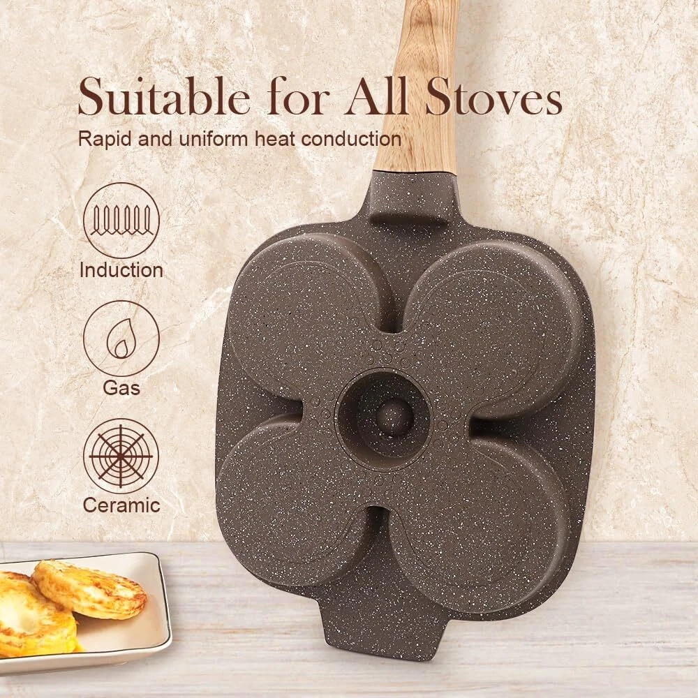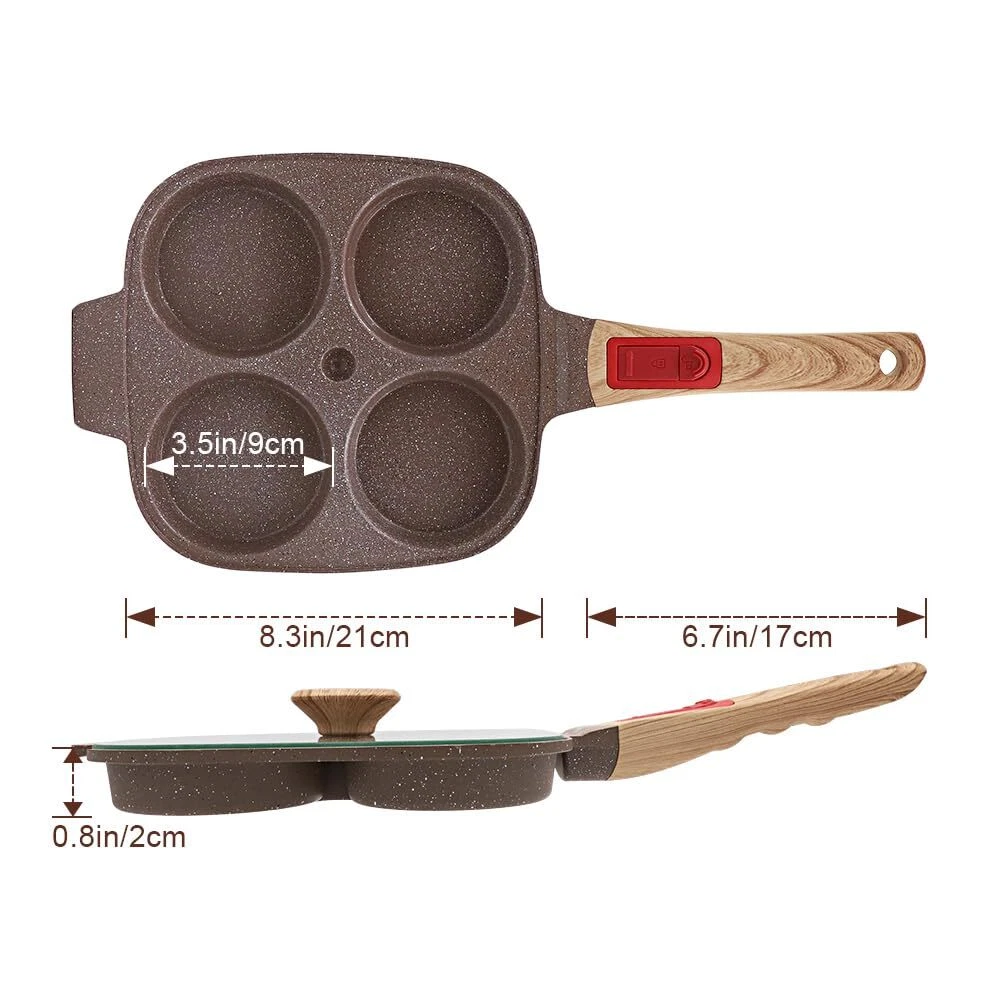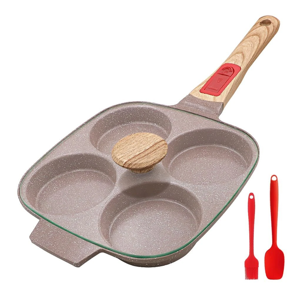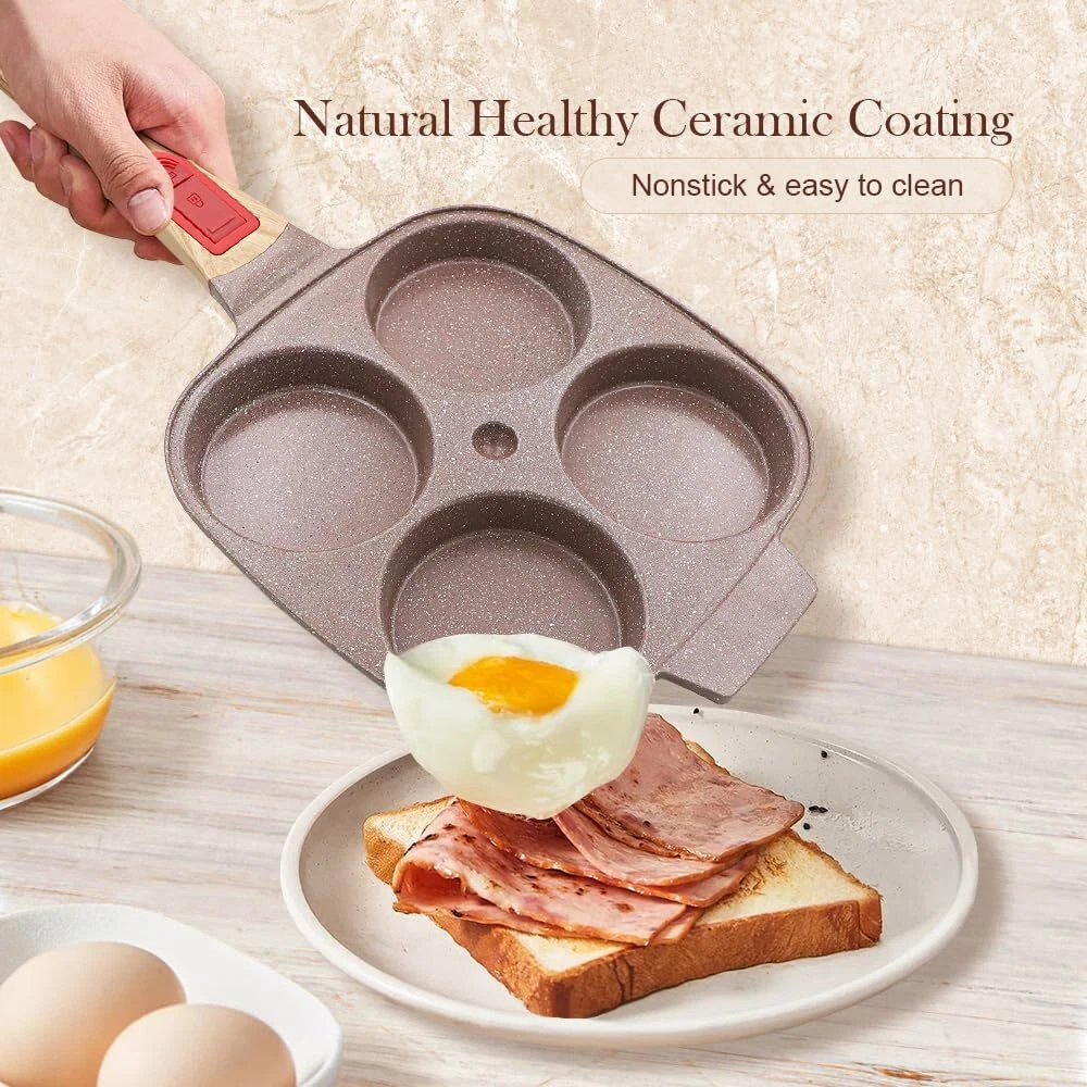 HEALTHY COOKING - The egg pan is made from high quality materials and covered with a healthy ceramic coating that is more durable than traditional coatings and free from any harmful substances including PFAS and PFOA. 4-CUP DESIGN - This omelette pan has a multi-hole design, so you can make 4 omelettes or pancakes at once, which is a great time saver. Comes with a flat lid that makes the food get a better flavor. APPLICATION - Suitable for all stoves. To protect the coating, low heat is recommended. Take care to use low heat when using on gas, as this pan is a little smaller than a regular pan and using high heat will likely burn the handle. EASY STORAGE - This egg pan is newly upgraded with a removable handle that can be easily removed with just a press, eliminating the hassle of turning screws and making it easy to either hang on the wall or put in a cabinet for storage. BOX CONTENTS - 1* ceramic egg pan, 1* silicone brush, 1* silicone spatula. Please feel free to contact us with any questions.