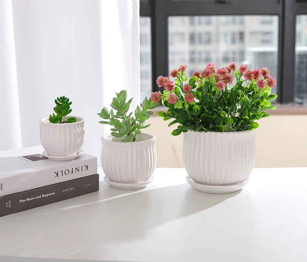 Ranging from small to medium sizes, this versatile contemporary style white ceramic flower plant pots set can be used to display your favorite succulents, flowers, cactus. Each vase contains a small hole in the bottom for drainage, keeps your plants and flowers stylish and healthy. Ranging from small to medium sizes, this classical white ceramic planter set can display your favorite succulents, flowers, cactus, orchid and much more Each modern planter contains a small hole in the bottom allows water to flow into the attached saucer, keeps your plants and flowers stylish and healthy. 3 flower pot set design is a nice match for both indoor and outdoor plants Using top quality ceramic material makes the flower plant pots pure white and stain resistance Approx. Dimensions: Large pot - 6.7Dia X 5.7H inches; Medium Pot - 5.1Dia X 4.5H; Small pot - 3.9Dia X 3.4H
