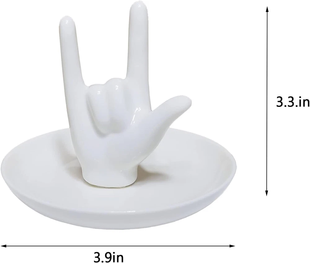 【Design】- I Love You Sign Language Ring Holder Dish 【Material】-Hand jewelry holder is made of ceramic 【I Love You Sign】-Suitable for wedding rings, earrings, necklaces, bracelets and so on 【Room Decor】- jewelry tray is the decoration for your bathroom, desk, bookshelf and more,Bring love and good luck for desktop room décor 【Gift Ideas】-I Love You gifts for her,valentine's day gifts,wedding gift,anniversary,birthday,Christmas,or Mother’s day The package includes:1 * ceramic hand ring holder