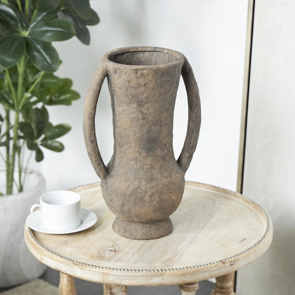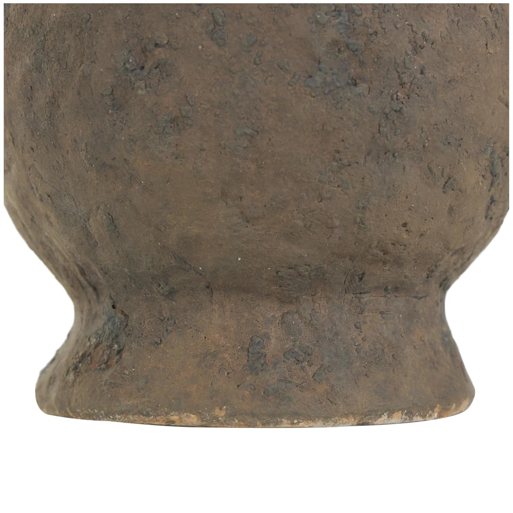 The rustic vase for home decor is handmade using stoneware, showcasing expert craftsmanship in every detail. The sandstone dark brown vase for dried flowers boasts a rounded shape and curved handles. Wipe clean with a dry cloth. The dark brown centerpiece vase is perfect for living rooms or dining tables. Designed with felt or rubber stoppers at the base that prevent scratching furniture and table tops, as well as sliding around. This item ships in 1 carton. Stoneware vase makes a great gift for any occasion. Due to the handmade nature of this item, no will be alike, there will be slight differences in shape, size, and color. Suitable for indoor use only. This item ships fully assembled in piece. This is a single dark brown colored vase. Rustic style. Vase has a 5.70 in mouth opening. RUSTIC HOME DÉCOR VASE: Designed with rugged beauty and an earthy charm, where natural simplicity, warmth, and organic materials create a wholesome atmosphere CERAMIC VASE FOR CENTERPIECE: The dark brown decorative vase is made from high-quality stoneware DARK BROWN AND BLACK VASE FOR FLOWERS: The round home decor vase features a dark brown color with a textured finish ROUND VASE FOR HOME DÉCOR: The stoneware vase boasts wide handles for easy handling and an added rustic charm LARGE SIZE FLOWER VASE CENTERPIECE: The dark brown ceramic vase measures 9.5L x 6.6W x 15.25H inches, and weighs 5.395 lbs