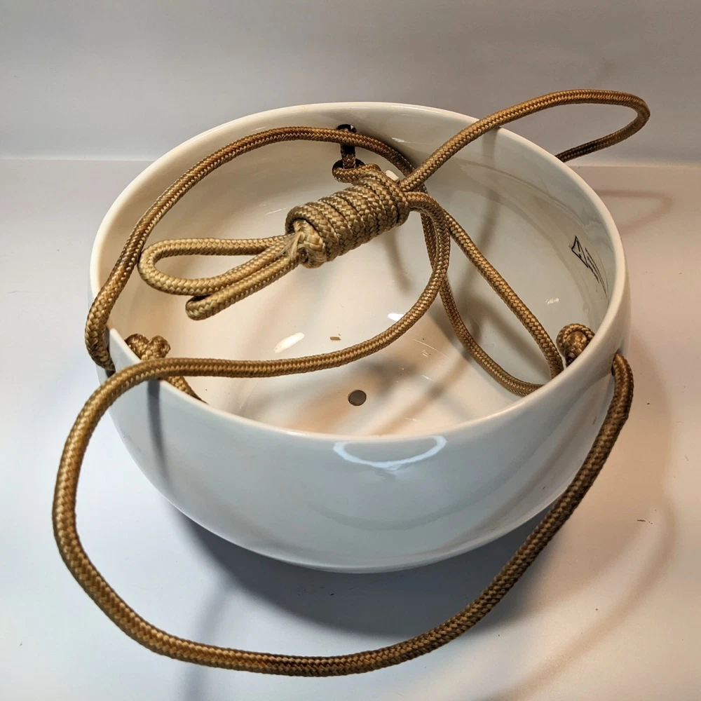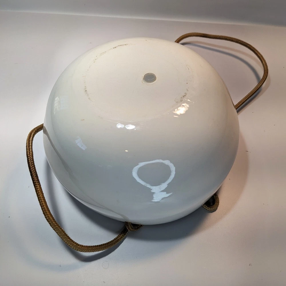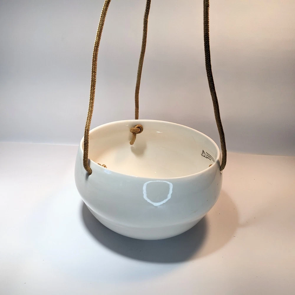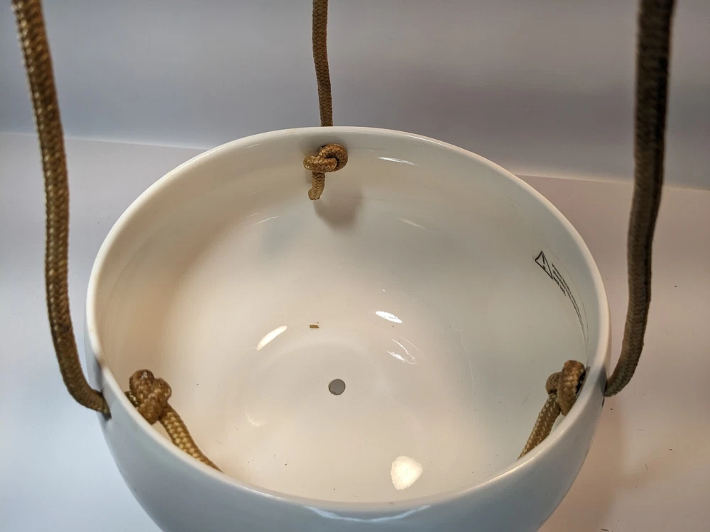 White ceramic planter with drain and hanging cord. 5 in (H) x 7.25 in (D) total height with cord 26 in Good pre-owned condition some signs of use and wear. The pictures shown accurately depict the item(s) you will be receiving; therefore, they should be considered part of the description. We encourage you to inspect every image. Contact us to ask questions or for specifics regarding this listing.