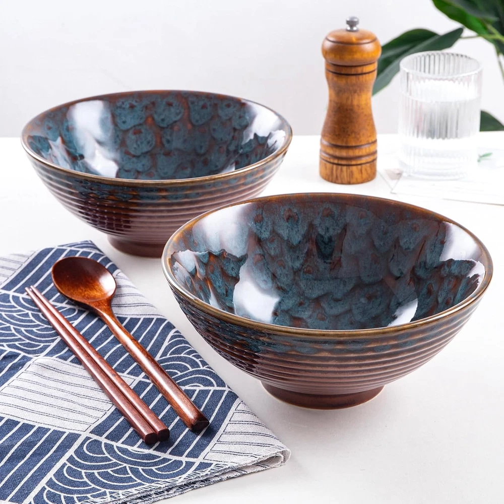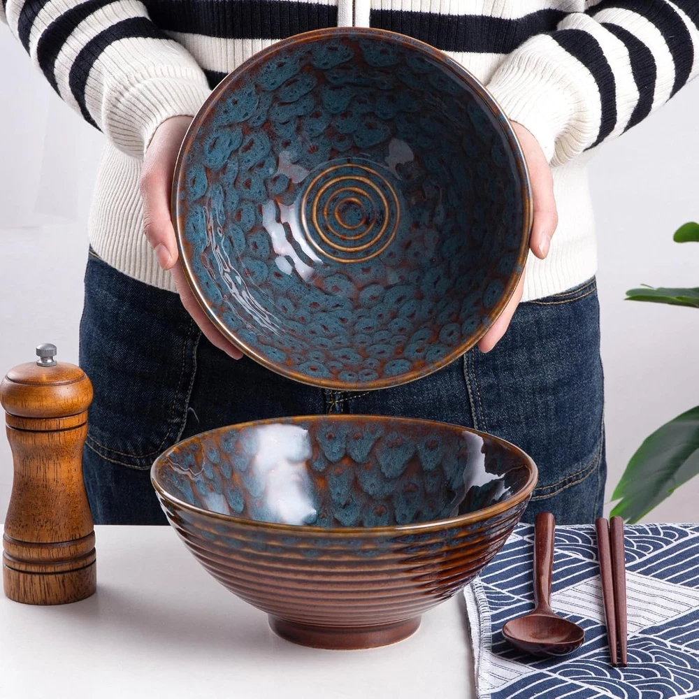 Store New Arrivals Add to Favorite View Feedback Contact Ceramic Japanese Ramen Bowl Set, 2 Sets Asian Pho Udon Soup Noodle Bowls with Spoons and Chopsticks (Peacock Green, 8 Inches) Description Item model number ramen bowl Included Components Bowl,Chopstick,Spoon Style Japanese Capacity 1.13 Grams Bowl Material Ceramic Color Peacock Green Pattern Solid Brand HOKELER Material Ceramic Is Dishwasher Safe Yes Number of Pieces 6 Item Weight 3.85 pounds Shape Round Size 8 inches Is Microwaveable Yes Special Feature Microwave Safe Package Dimensions 9.25 x 9.21 x 7.2 inches Product Care Instructions Dishwasher Safe Manufacturer HOKELER PERFECT SIZE - Our ramen bowls are 8 inches in diameter with a 40 oz capacity. These bowls are large and deep enough for ramen, pho, udon, noodle, soup, and dumplings without splashing out. SAFE & DURABLE - These ramen bowls are made of high-quality ceramic which is durable, NON-TOXIC and LEAD-FREE, chip-resistant. They are Microwave safe, Dishwasher safe, Oven safe, and Freezer safe. EASY TO CLEAN - The surface of these ramen bowls are smooth due to the perfect glazed coating, making them easy to clean, resists scratch, and durable for everyday use. PACKAGE INCLUDED - 2 x Ceramic Ramen Bowls, 2 x Spoons and 2 pairs of Chopsticks. RISK-FREE PURCHASE - We will offer a refund or a free replacement if you receive a damaged or defective item. Please feel free to contact us. Product description Details Traditional Design Screw thread design, large and deep enough for various food. Safe & Durable: These bowls are made of durable ceramic, LEAD-FREE and NON-TOXIC, chip-resistant. Microwave, oven, dishwasher, and freezer safe. Suitable for: Ramen, pho, udon, noodles, wonton, broth, stew, soups, vegetables. ABOUT US We offer the best prices around on high quality products. Our E-store includes media such as books, movies, music and games while offering electronics, toys, sporting apparel, clothing, tools, general home, garden items and more. SHIPPING We are always working hard to ensure your package arrives as soon as possible. Please understand that some factors like weather, high postal traffic, and the performance of shipping companies are outside of our control. We offer free shipping to the lower 48 states and ship within 2 business days of payment, usually sooner. We do not accept P.O. Boxes. Please provide a physical address. RETURNS We offer a 30-Day Return Policy on items which you are not completely satisfied with. You have the option for a full-refund or an exchange of the item. No returns are available on items shipped outside of the USA. PAYMENT We accept PayPal. CONTACT US This page content is yet to come Please ad us to your favorite seller and visit again later Thank You CUSTOMER SATISFACTION We try our very best to make sure every customer is completely satisfied. If there's a problem, message us! We're happy to help.