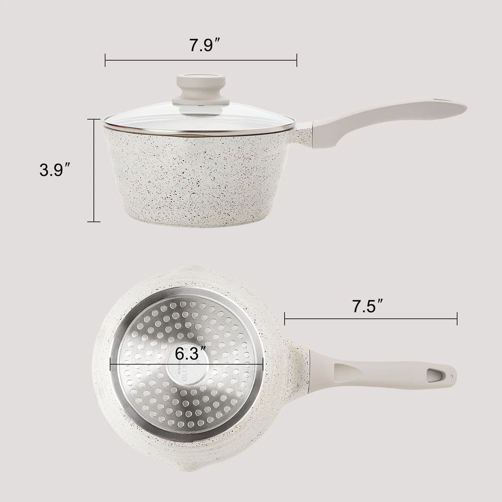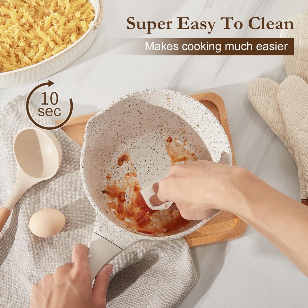 2.7QT Sauce Pan with Lid from France, Ceramic Non Stick Small Pot for Cooking, Kitchen Induction Pot with Pour Spout, Easy to Clean, PFOA and PFAS Free, Dishwasher Safe, White Granite Safe and Non-Toxic: Saucepan is coated with high quality German Weileurg ceramic coating, which is non-toxic and PFAS/PFOA free, no lead, cadmium and other toxic materials. Can be operated with a steel spatula and 10x longer lasting than traditional coatings. Promotes healthy eating by reducing the need for excess oil Universal Compatibility: The base of this saucepan is made of highly conductive stainless steel and is suitable for all hobs including induction and gas. The cast aluminium core ensures even heat distribution and prevents hot spots. The saucepan is perfect for making sauces, oatmeal, pasta, or vegetables such as potatoes Bakelite Handle: 2.7 qt saucepan with lid set feature ergonomic and comfortable bakelite handles that stay cool and are safer during the cooking process. The non stick saucepan comes with a tempered, heat-resistant glass lid to monitor the cooking process at all times, making induction saucepan with lid easier to control Dual Pour Spouts: The built-in pour spouts on both sides of our saucepan with lid offer great convenience, catering to both left- and right-handed users for a seamless cooking experience Dishwasher Safe: Saucepan with lid feature a rivet free design that prevents food from getting stuck and makes cleaning a breeze. Place the nonstick sauce pan in the dishwasher for easy maintenance. For hand washing, simply wipe them down with a sponge and soapy water and you're ready to prepare three meals a day Guaranteed Customer Satisfaction: Each of our cookware undergoes a professional and strict quality inspection to ensure the superior quality of our sauce pans. If you receive any defective product due to delivery or encounter any problem while using the saucepans, please feel free to contact us and our customer support team will provide excellent service within 24/7