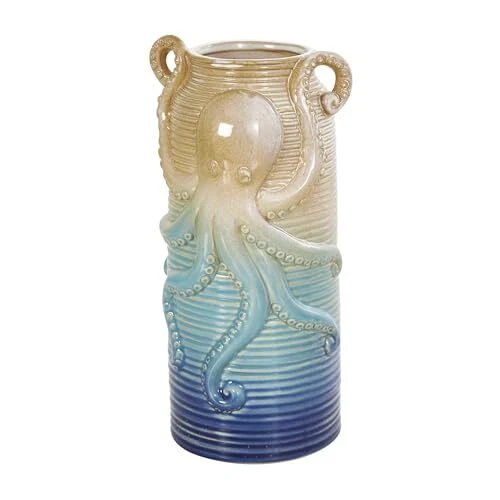 Each contemporary set of 2 vases for home decor is molded from stoneware to showcase intricate design and craftsmanship. The glossy blue vases for faux flowers have a rounded shape with an ombre effect and an octopus ribbed design, adding elegance. Wipe clean with a dry cloth. The octopus set of 2 centerpiece vases is perfect for enhancing any living room or dining area. Designed with felt or rubber stoppers at the base that prevent scratching furniture and table tops, as well as sliding around. This item ships in 1 carton. Stoneware vase makes a great gift for any occasion. Suitable for indoor use only. This item ships fully assembled in piece. This blue colored stoneware vase comes as a set of 2. Contemporary style. Vases have 3 in, and 2.50 in mouth openings. CONTEMPORARY HOME DÉCOR VASES: Embrace artistic expression with a style that highlights bold designs with sleek lines, neutral elements, and a minimalist aesthetic CERAMIC VASES FOR CENTERPIECE: The blue decorative vase set is crafted from high-quality stoneware and glazed beautifully BLUE AND CREAM VASES FOR FLOWERS: The round home decor vases set features a glossy finish with a blue, teal, cream, and gold color ombre effect OCTOPUS ROUND VASES FOR HOME DÉCOR: The stoneware set of 2 vases boasts dimensional ribbed detailing and an octopus motif that enhances its visual appeal 2 SMALL SIZE FLOWER VASES CENTERPIECE: Each blue ceramic vase measures 7L x 4W x 9.55H , 4.4L x 4.4W x 10.05H inches, and collectively weighs 4.385 lbs