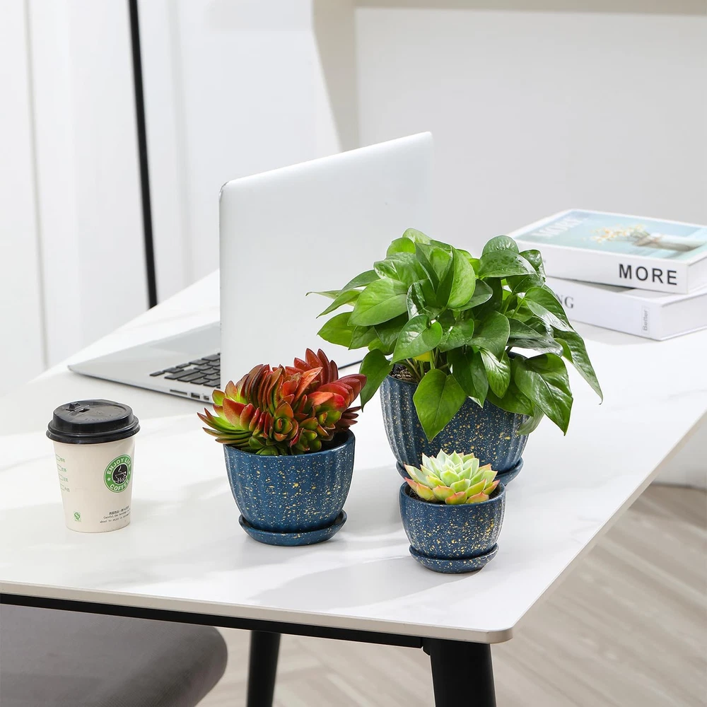 SMALL PLANTER SET: These garden plant pots are made of ceramic and come in three sizes: Medium width is 5.5 inches (14 cm), Small width is 4.3 (11 cm) inches, and nimi width is 3.3 inches (9 cm). They are fired at high temperature, so they are durable and lightweight.. CUTE PLANT POTS : You can use these home decorative flowerpot to plant your succulent, cactus, monkey tree, orchid, snake and so on.You can choose suitable flower pots based on the growth of plants. UNIQUE PLANT POTS : Made of high-quality ceramic materials, Their design is lightweight, simple and elegant, suitable for pairing with various interior decoration styles, adding greenery to your home. PLANTER WITH DRAINAGE: which can effectively protect plants from excessive watering. Whether you are planting succulent plants, small flowers, or herbaceous plants, These set of flower pots is the ideal choice. STHIE PROMISE : We provide a free refund or replacement for any STHIE plant pots products, anytime. Just let us know what happened. We offer daily customer service because you are important to us. Product Description Ceramic Plant Pots With Drainage Holes And Saucers A must-have for all indoor plant enthusiasts. This set of 3 circular flower pots is designed to provide a comfortable home for your beloved plants. Crafted from high-quality ceramic material, these planters offer durability and longevity. The ceramic construction also adds a touch of elegance and sophistication to any indoor space. Whether you have succulents, orchids, or any other indoor plants, these pots are suitable for various plant types. 1 Blue With Dot 2 White Floral 3 White With Dot 4 White Modern & Unique Ceramic Flower Pots For Indoor Plants This flowerpot comes in three sizes and is multifunctional, suitable for different plant sizes and arrangements. They can easily be placed on windowsills, tables, shelves, or any other indoor surface, adding beauty and greenery to your living space. 1 White Floral 2 White 3 White With Dot 4 Blue With Dot People also browsed Add to Cart Add to Cart Add to Cart Add to Cart Add to Cart Add to Cart Add to Cart Price $13.99 $ 13 . 99 $19.99 $ 19 . 99 $25.99 $ 25 . 99 $18.99 $ 18 . 99 $18.69 $ 18 . 69 $16.49 $ 16 . 49 $25.99 $ 25 . 99 Material Ceramic Ceramic Ceramic Ceramic Ceramic Ceramic Ceramic Number 3 a Set large 3 a Set large 3 a Set 2-piece set One PCS One PCS large 3 a Set Drainage flowerpot Yes Yes Yes Yes Yes Yes Yes Diameter 3.5"/4.3"/5.5" 4.3"/5.5"/6.8" 4"/5.2"/6.7" 4.3/4.3" 4.8" 5" 4"/5.2"/6.7" Brand STHIE STHIE STHIE STHIE STHIE STHIE STHIE