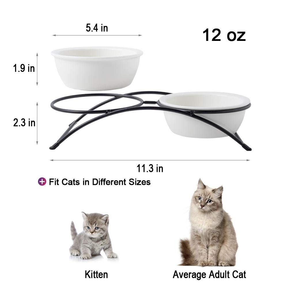 Unique Design: The feeding bowl dimensions are 5.4’’ wide and 1.9 '’ deep. The shallow and wide shape prevents whisker fatigue, while rounded edges make it easy for your cat to get every bit of food. Plenty deep to contain your cat’s food without spilling. Protect the Pet's Cervical Spine: The elevated cat bowl put a cat's mouth at a better position in relation to its stomach, it helps cat swallow more easily. Smooth stand,Non-slip: keeps the cat bowl in one place, the hungry cat can't push around the water and food. Keep away from mess. High Quality Ceramic: Ceramic materials are smooth and not easy to hide dirty things, it's good for kitty's health. Microwave & dishwasher safe, easy to clean. No break or shatter while using, or in transport. Sturdy and Practical Design: This set includes two 12oz ceramic bowls, perfect for small cats. Separate food and water bowls reduce refills and easily meet your cat’s daily needs. Comfortable Dining Height: Slightly elevated to reduce neck strain, this design makes meals easier to swallow, promoting better digestion for your cat’s comfort and health. No-Slip, No Mess: Four anti-slip rubber feet keep the metal stand stable, preventing tipping or sliding for a clean, organized feeding area—ideal for eager eaters. Durable and Easy to Clean: Made from long-lasting ceramic, these bowls resist odors and are dishwasher safe for quick and easy cleanup. Elegant Design with Fun Patterns: Featuring cute paw or bone prints, this black-and-white set complements your home décor while adding a playful touch to your pet’s meals.