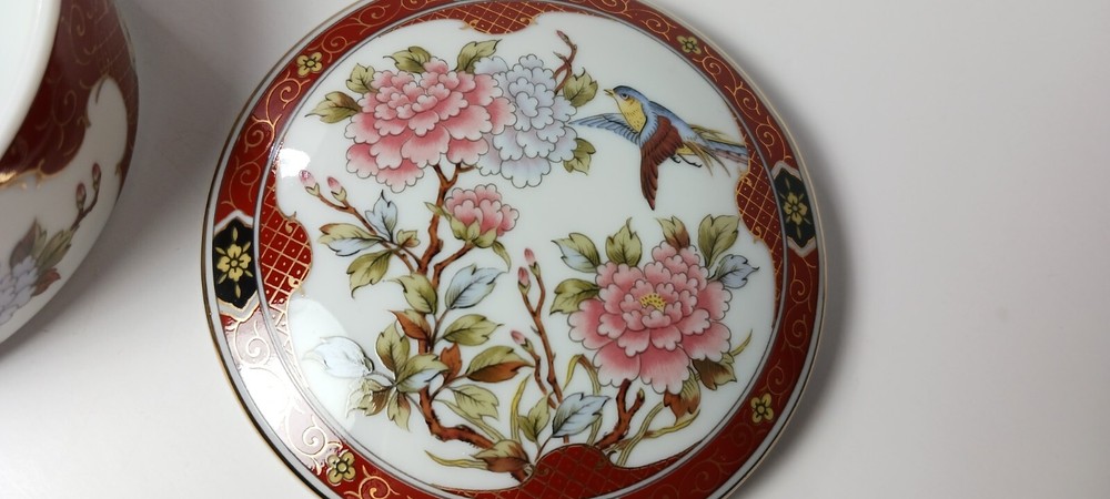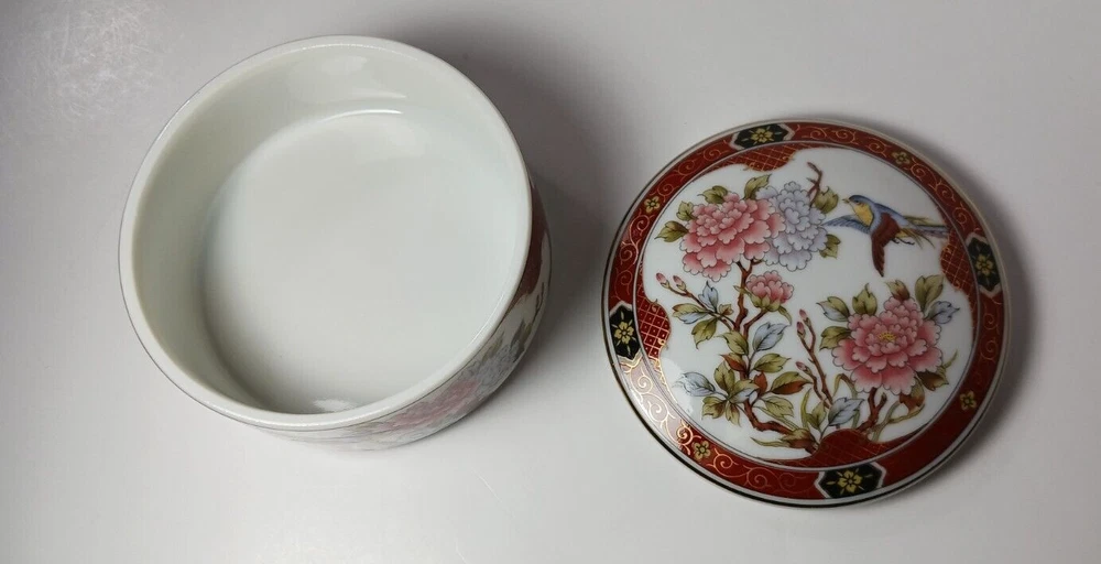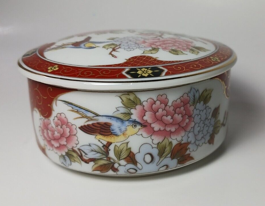 Ceramic Round Jewelry Ring Box with Bird and Flowers Design