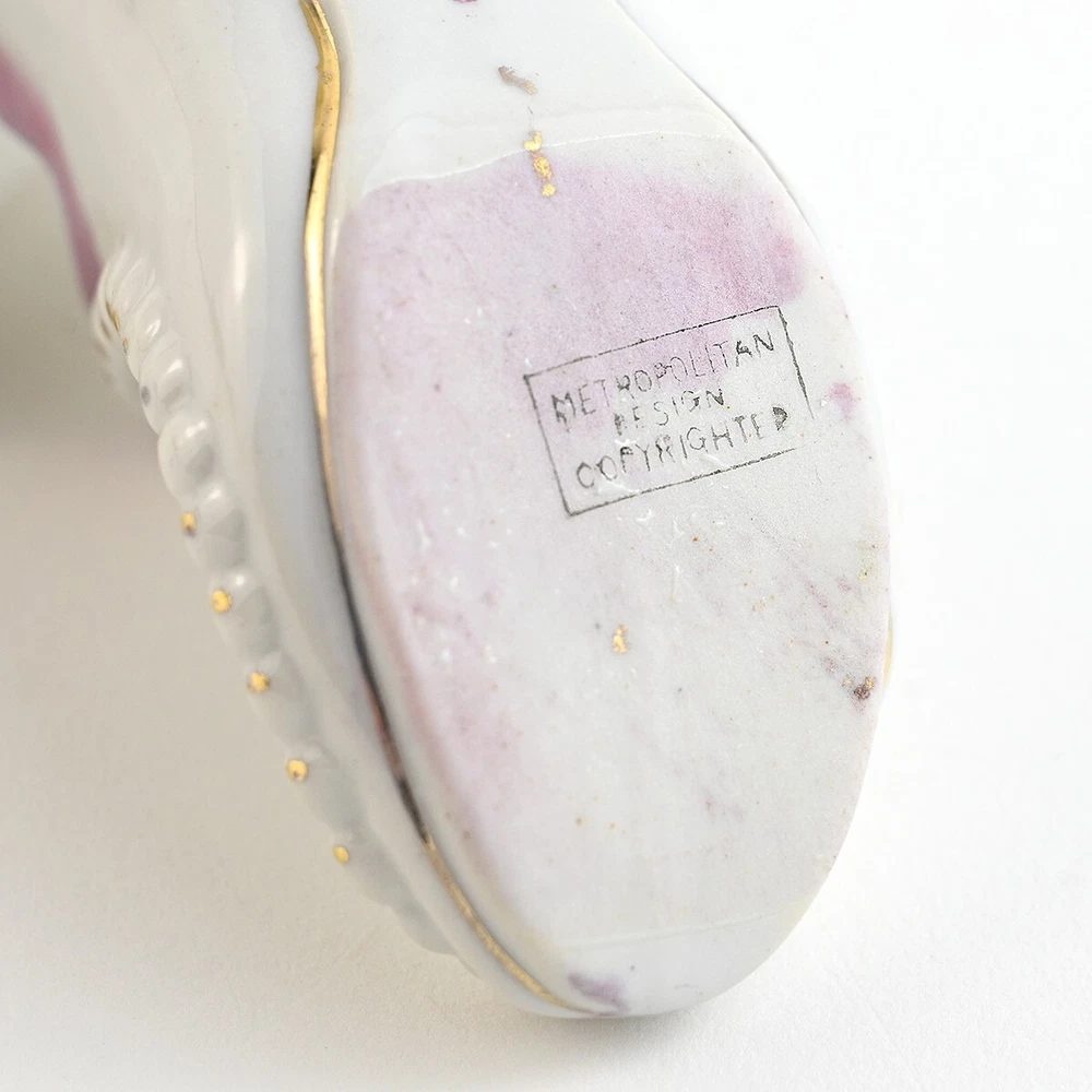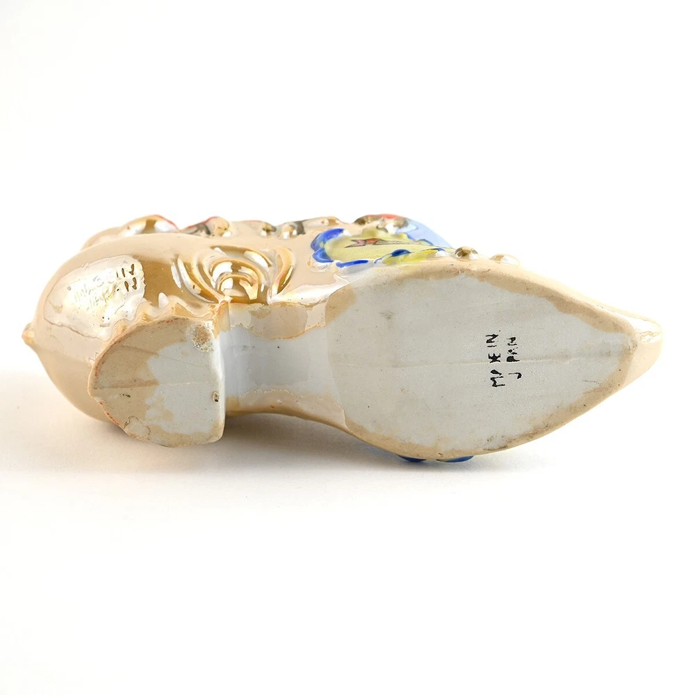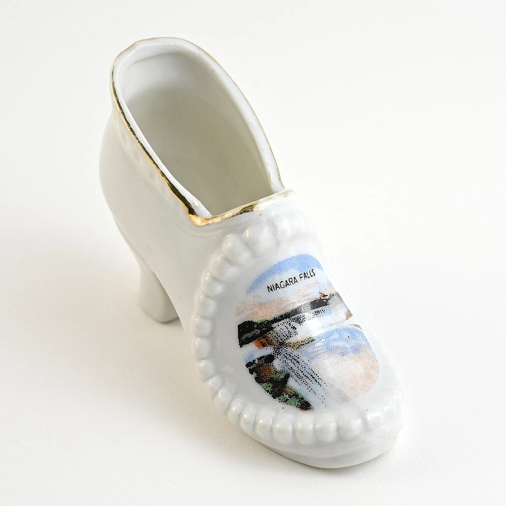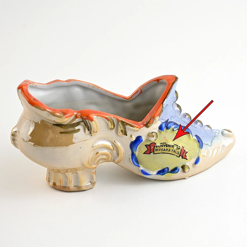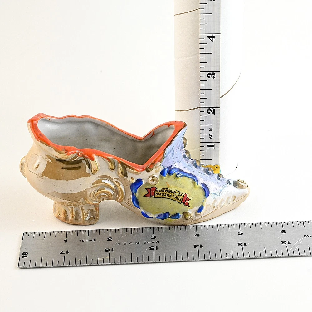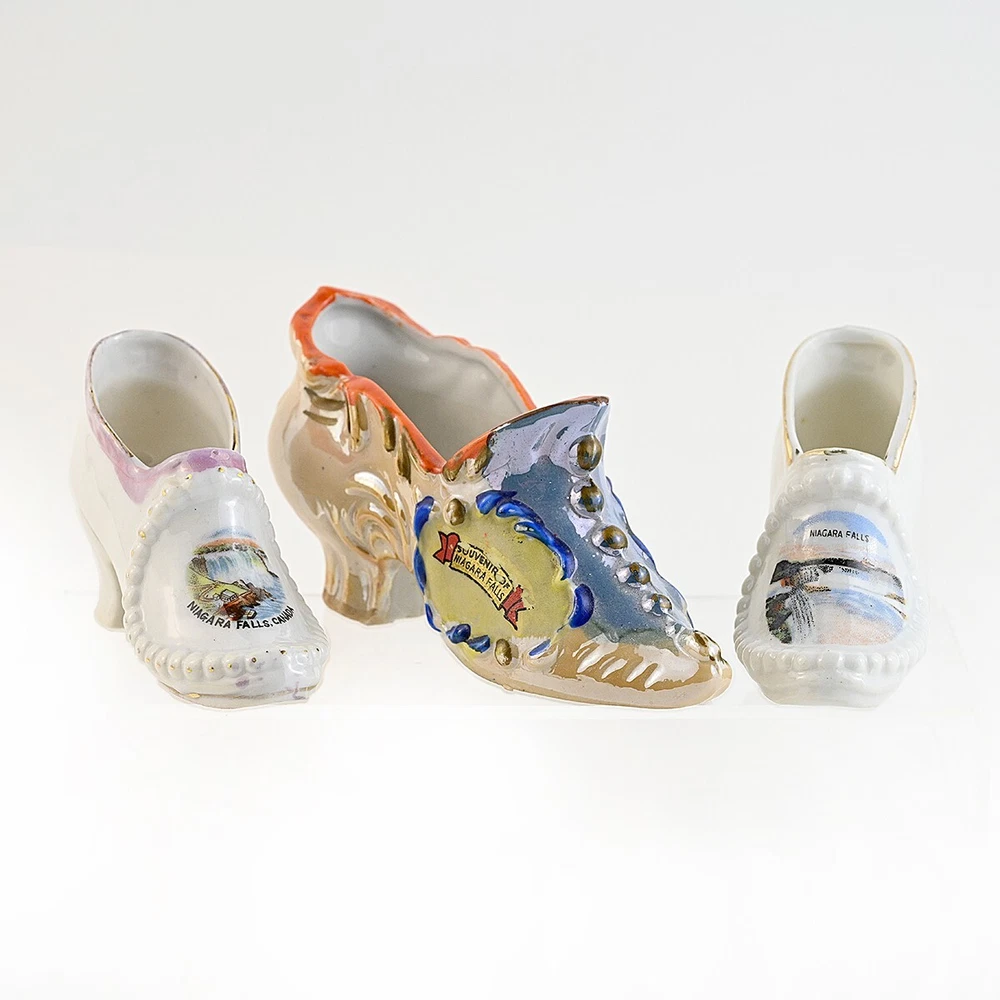 For sale are a lot of 3 Victorian Style Ceramic Shoes. They are all souvenirs from Niagara Falls. There is one larger shoe that measures about 5.5 inches long. It is very colorful in gold and blue luster with orange & yellow accents. This shoe has a decal saying Souvenir of Niagara Falls which is legible but warn. It is stamped and embossed Made in Japan. The other two shoes are smaller, about 3.5 inches long and both are decorated with different scenes from the Falls. One is stamped Made in Occupied Japan and the other is stamped "Metropolitan Design Copyrighted". These are all vintage items and so are pre-owned and used. They may show some signs of cosmetic ware but are in good condition with no chips nicks or cracks. It may have some imperfections caused during hand painting or the manufacturing process. The decal on the largest shoe shows wear. Please see images for size, condition and details. Feel free to reach out to me with any questions and thanks for looking! Your item will be packaged carefully and mailed the best way with tracking.
