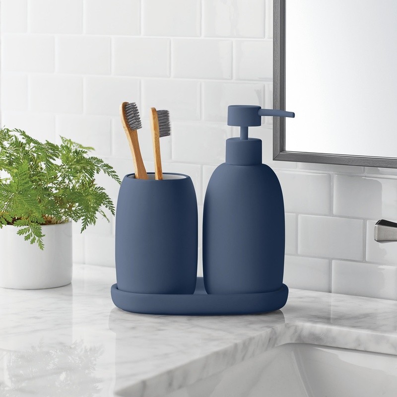 You may also like Multicolor Ceramic Bath Accessories Set Soap Dispenser Toothbrush Holder 2pc New 26.41 USD 27.8 USD Free shipping 5% off 20 Piece Bathroom Accessory Set Shower Curtain Soap Dispenser Toothbrush Holder 36.8 USD 38.74 USD Free shipping 5% off Modern Round 3-Piece Bath Accessory Kit Towel Bar Ring Toilet Paper Holder New 42.13 USD 44.35 USD Free shipping 5% off Modern Round Bath Accessory Kit 3-Piece Set Towel Bar Ring Holder Satin Nickel 42.13 USD 44.35 USD Free shipping 5% off Easily update your bathroom with the Bath Accessories 3-Piece Set, available in three stylish colors: white, grey, and blue. This set includes a tumbler for toothbrushes and other small items, a soap pump dispenser for lotion or bath soap, and a versatile accessory tray to organize jewelry, makeup, or other essentials. The sleek, modern design adds a sophisticated touch to your bathroom while helping to keep everything neatly organized. Featuring rubberized bottoms, the set ensures your countertop accessories stay securely in place. Multi-functional and easy to clean, this set is perfect for creating a clean, stylish look in any bathroom. Whether for a guest bathroom or your own, the Bath Accessories 3-Piece Set offers both practicality and a modern aesthetic. Available in 3 colors – Choose from white, grey, and blue to complement any bathroom style. Multi-functional set – Includes 1 soap pump dispenser, 1 toothbrush holder (tumbler), and 1 accessory tray to organize small items like jewelry or makeup. Rubberized bottoms – Keeps your countertop accessories securely in place and prevents sliding. Perfect for adults – Designed with a stylish, adult-friendly aesthetic, this set is ideal for any bathroom décor.