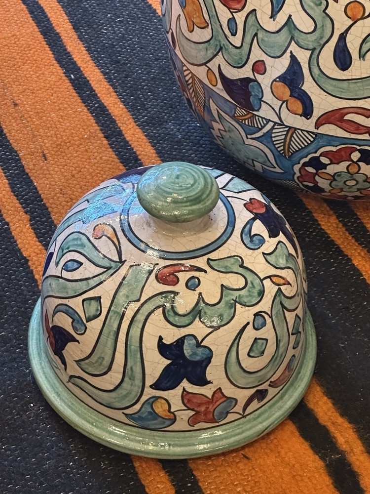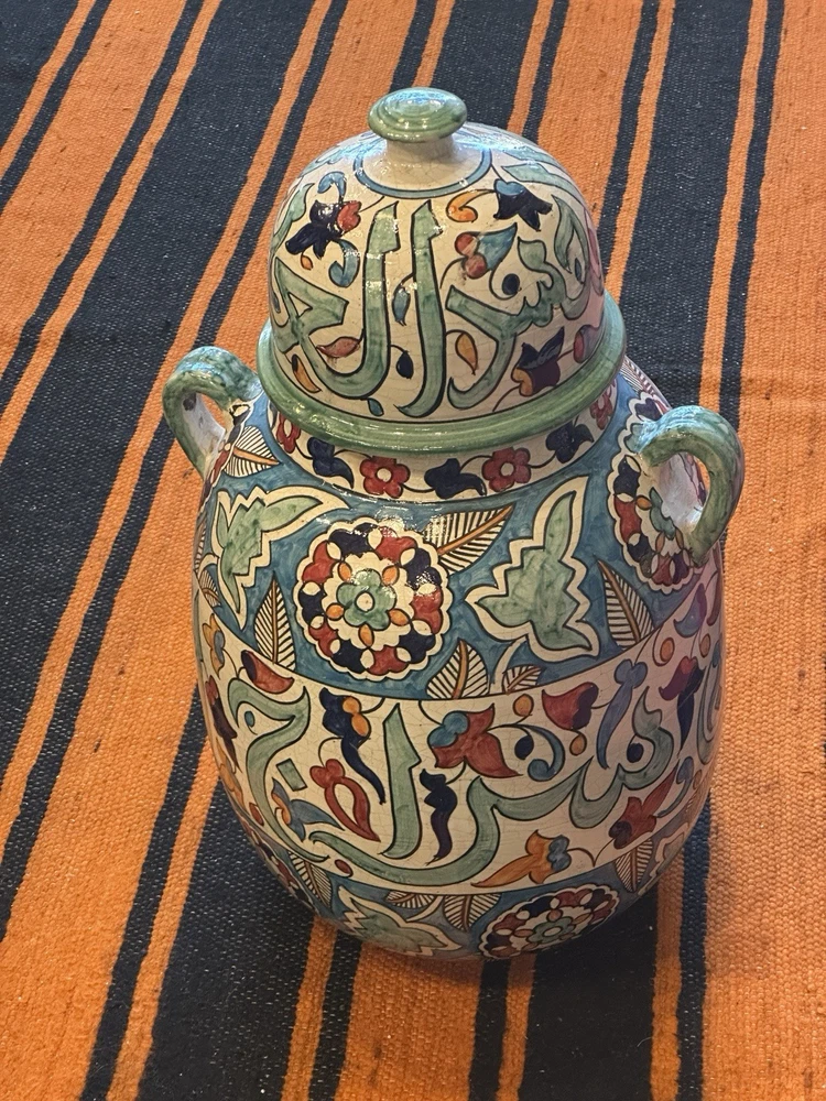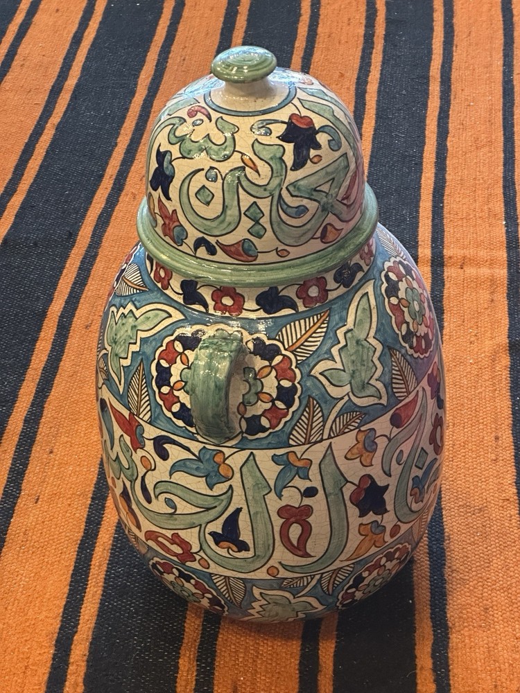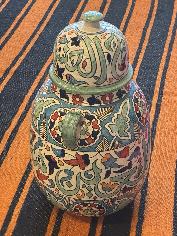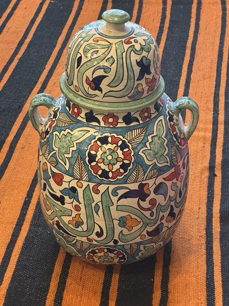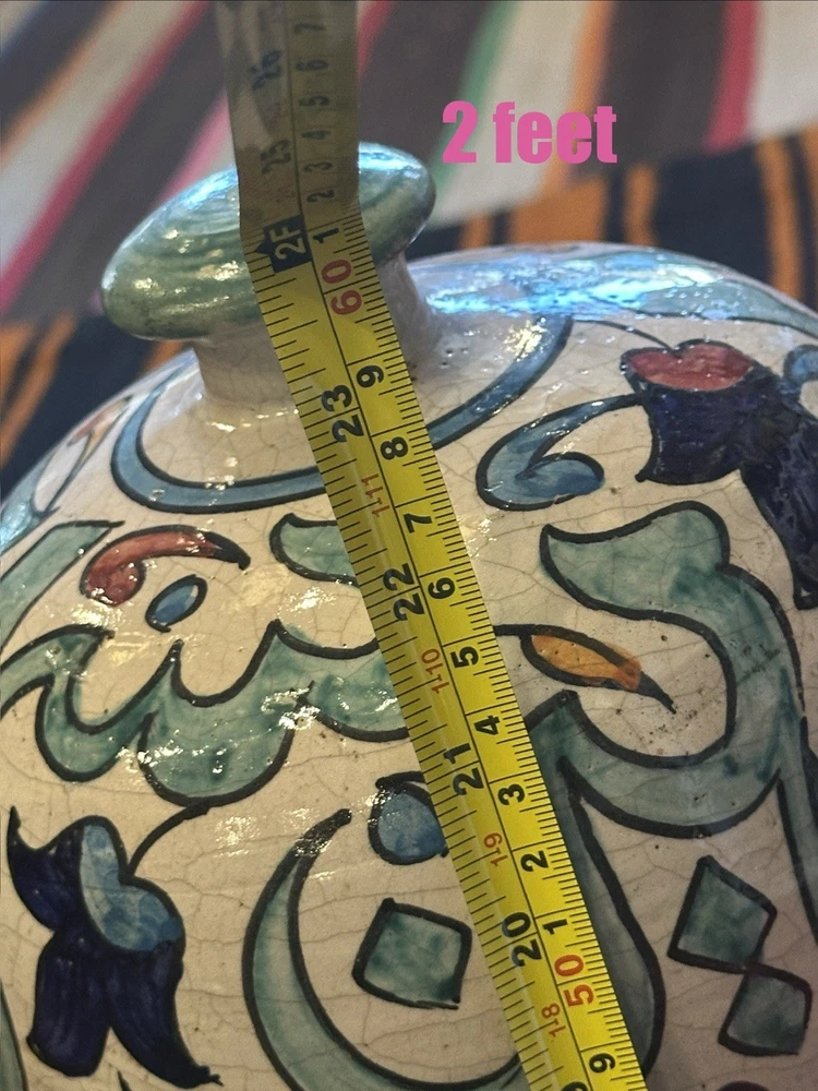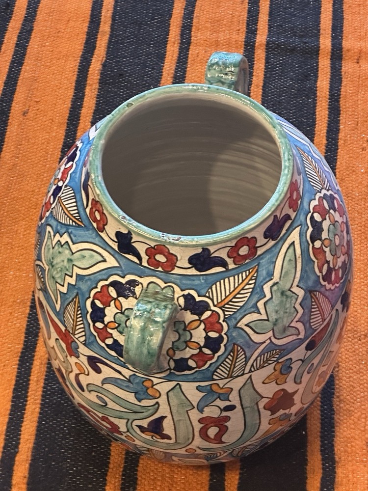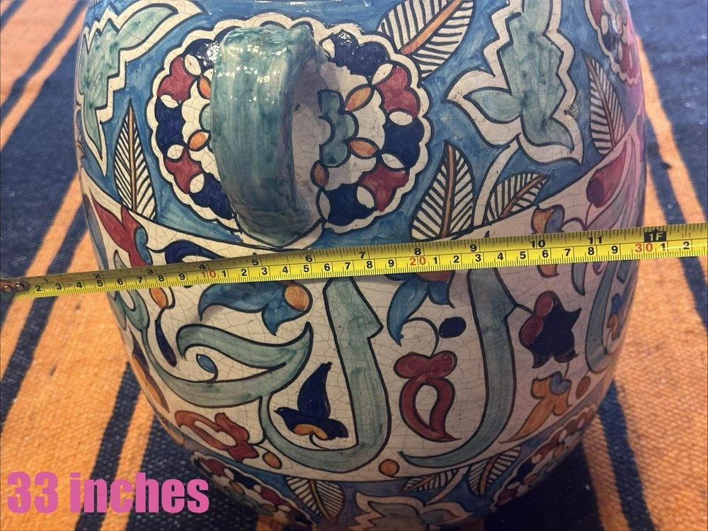Theme: Art Shape: Round Material: Ceramic Care Instructions: Clean with Damp Cloth Handmade: Yes Original/Reproduction: Original Style: Moroccan Item Height: 26 in Glassmaking Technique: Hand Blown Color: Multicolor Pattern: Floral Signed: Yes Brand: Handmade Occasion: All Occasions Subject: Africa Features: Hand Painted, Tassels Size: Large Time Period Manufactured: 1980-1989 Country of Origin: Morocco Item Weight: 22# Department: Adults Antique: No Type: Vase Number in Pack: 1