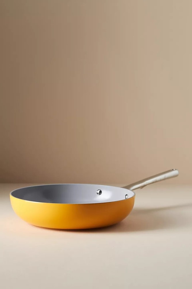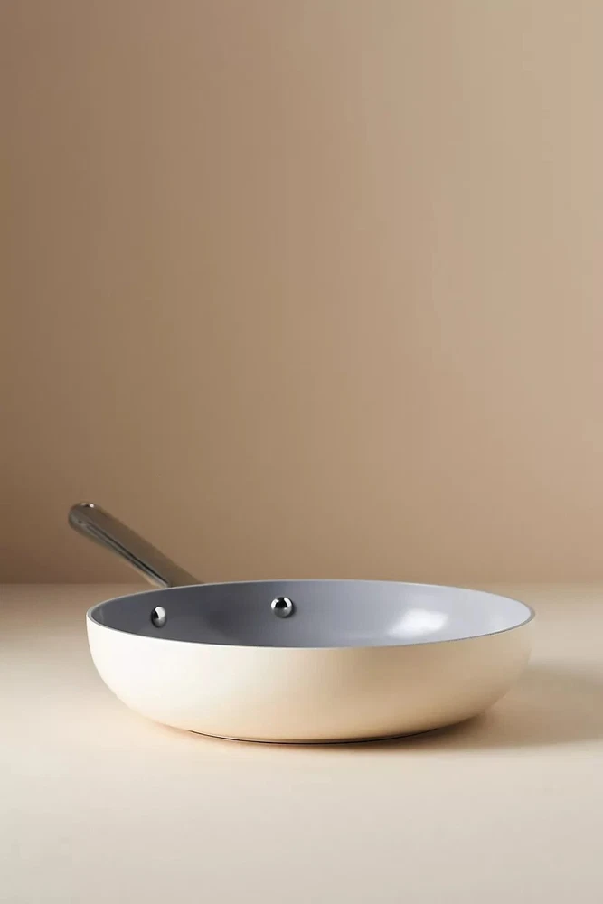 Caraway's Fry Pan allows for healthy cooking in the kitchen without harmful chemicals: use for slide-off-the-pan eggs, sautéing veggies, and more. Featuring a non-toxic ceramic-coated interior, this durable non-stick pan makes cooking easier than ever, cleaning (dare we say) enjoyable, and adds a pop of color to any home. Lid sold separately Ceramic-coated aluminum, aluminized steel Non-stick Hand wash; dry thoroughly before storage Not dishwasher or microwave safe Oven safe up to 550°F Imported Dimensions 10.5" diameter
