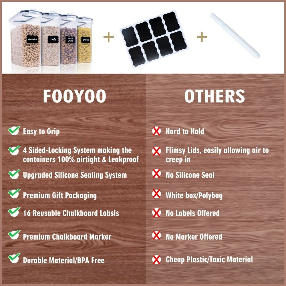 eBay Cereal Containers Storage Set - 4 Piece Airtight Large Dry Food Storage Containers(135.2oz), BPA Free Dispenser Plastic Cereal Storage Containers with 16 Labels & Pen - FOOYOO ✓ Free 60 Day Returns ✓ Free Express Shipping Description: Read more Read more Clearly Visible Gradation Marks: We’ve made it easier to identify internal contents by ensuring our see-through boxes are crystal clear, so you better organize your pantry, freezer, fridge, or personal space. The Package included: 4 × 4L(135.2oz) Cereal Storage Containers 1 Marker 16 Labels Leakproof & Watertight: Four-sided lock plus sealing rubber ring 100% leakproof.With this upgraded sealing system, our food storage containers not only keep your food fresh and dry but also keep those pesky pests out. Read more Keep Food Fresh and Save Space in the Kitchen with Stackable,Reusable Food Storage Containers from FOOYOO. Whether you’re looking for a smart, healthy way to meal prep and stay ahead of your diet plans or you simply want to keep cereal, foods, or snacks more organized until your family is ready to enjoy them, the right containers can make all the difference.That’s why we created FOOYOO BPA Free Cereal Containers that come in plenty of different sizes and styles to help you stay organized and improve the freshness of your favorite foods. 4pcs cereal containers 3pcs cereal containers 6pcs cereal containers 4pcs food storage containers Material Silicone+PP Silicone+PP Silicone+PP Silicone+PP Package Included 4 Large Containers (4L, 135.2oz) 3 Large Containers (4L, 135.2oz) 4 Large Containers (4L, 135.2oz) 4 Large Containers (4L, 135.2oz) 1 Marker 1 Marker 2 Medium Containers (2.5L, 84.5oz) 1 Marker 16 Reusable Labels 16 Reusable Labels 1 Marker 16 Reusable Labels 16 Reusable Labels 1 Measuring Cup BPA Free ✓ ✓ ✓ ✓ Airtight ✓ ✓ ✓ ✓ Dishwasher Safe ✓ ✓ ✓ ✓ Features: PREMIUM PACKAGE: Your complete cereal containers storage set includes 4 premium large cereal storage containers (4L/135.2oz), 16 Free reusable Labels & 1 Marker for your perfect pantry experience. MULTIFUNCTIONAL SPECIALTY: These airtight food containers are not only IDEAL for storing Cereals but they are also PERFECT for storing Flour, Nuts, Sugar, Rice, Snacks, Pasta, Coffee, Tea, Pet food or anything you like. AIRTIGHT & KEEP FRESH: These durable & dishwasher safe airtight containers feat 4 Sided-Locking Lids with Silicone Seal. To ensure that no air or water enters in, keep your cereal dry, safe from moths, ants and other pests, and keep your food fresh longer. POUR THE FOOD OUT EASILY: With a hole in the lid, you can pour the food out easily without opening the lid. To enhance the sealing capabilities of these plastic food storage containers, we add the silicon seal around the flip lid opening. Our airtight containers are designed with comfortable ergonomic grips, you can hold the container effortlessly even its full. SOLID FUNCTIONALITY & SPACE SAVING: Clear plastic makes things easy to check how many cereal or food remain. In addition, Our cereal container has a narrow body which requires less space and will easily fit into your refrigerator, freezer or cupboard, enables you to get the kitchen organized and frees up space in the pantry. Product Details: Product Dimensions: 9.65 x 4.5 x 9.65 inches Item Weight: 3.49 pounds Is Discontinued By Manufacturer: No Date First Available: March 2, 2019
