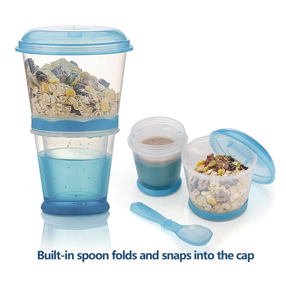 Portable Yogurt and Cereal To-Go Container Cup BPA Free Cereal Container: BPA-free, food-grade plastic makes it a safe and reliable food storage option. Allows your cereal, yogurt, fruit and other favorites to stay chilled and fresh with special cool pack. Retain Freshness: This attractive yogurt and cereal to go cup keeps your cereal, fruits, granola, and nuts fresh all day. Refrigerator safe. Not for Microwaves. Brilliant Colors: It is reusable and ideal for easy grab food or meals. Even more, there are three brilliant colors to choose from- blue, rose red and green. Pick one and place an order right away! Ideal Size: Meets the perfect 12 oz portion size for an 'on the go' milk and cereal container and can easily fit in your lunch bag or double up as a snack box. Convenient: Air-tight and leak-proof mechanism keeps your food wonderfully fresh. You can carry it easily and use it for any purpose, from school or office lunch, to trips, picnics and more. Warranty: 100% GUARANTEE - Zero Risk to Buy! No-hassle money back guarantee. ANY defectiveness for ANY reasons, we guarantee a new replacement or full refund without any hassle. Specifications Cereal container: 12 FL oz (355 mL) Milk cup: 5.7 FL oz (170 mL) Weight: 0.3lb / 138g Usage _Keep your milk cold and separate from your cereal. _Simply pour the milk into the cereal bowl section for a quick snack. _Portable! The milk stays cold by keeping the gel filled cup in freezer.Once the gel is frozen, pour your milk in the cup portion and twist the bottom cup to the cereal bowl section. Once they are together you'll have Cereal On The Go. Package Include 1 ╳ Cereal To-Go Container Cup(Folding spoon include) How to use: When you receive this cereal cup, please let it stand for an hour to allow the heat preservation hydrogel to return to the correct position. Since the hydrogel at the bottom of the cereal cup may be inverted during transportation, just stand it upright for an hour to allow the hydrogel to return to its normal state and then you can use it normally. Made from BPA-free material. Perfect for cereal & milk, or yogurt & granola. Non-toxic freezer gel cup keeps milk cold and fresh for up to 6hrs. Twist-off cereal cup. Folding spoon snaps into cap. Can be safely reused. Ergonomic design. Portable Cereal to go anywhere you want. Enjoy your fresh Cereal at work, at sports, on excursions or at school.