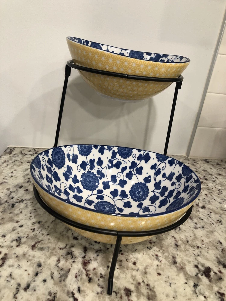 HomeCertified International Blue and Yellow Serving Bowl Set with Stand New Without Box