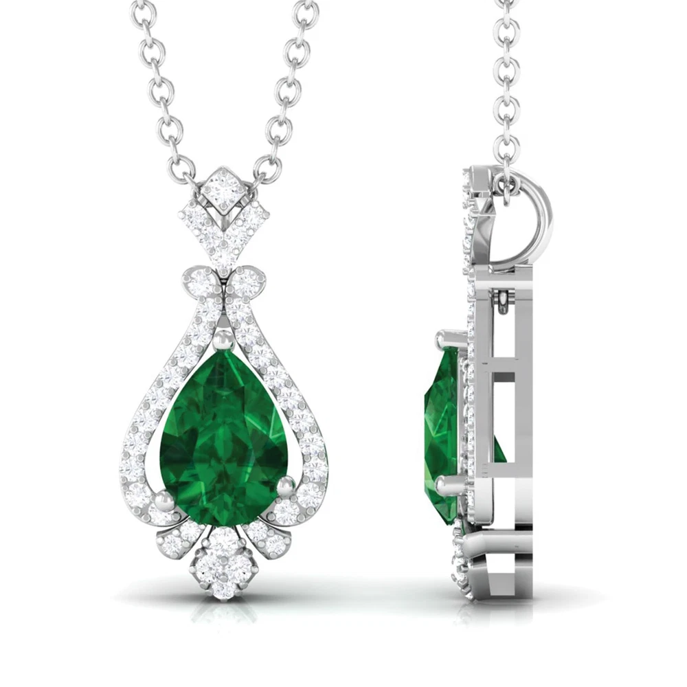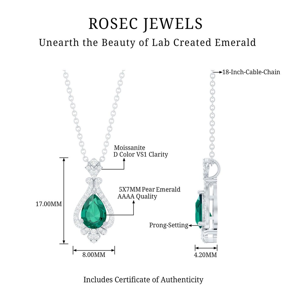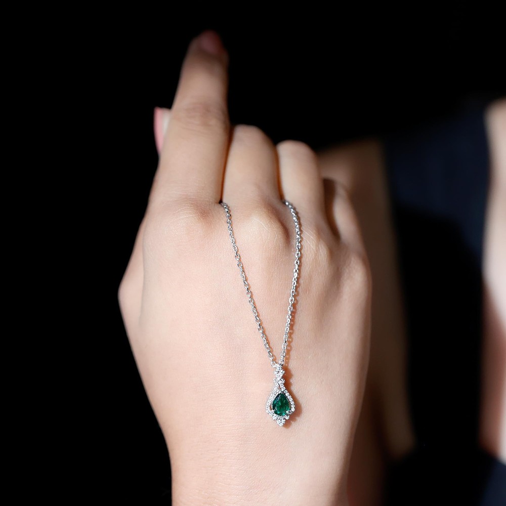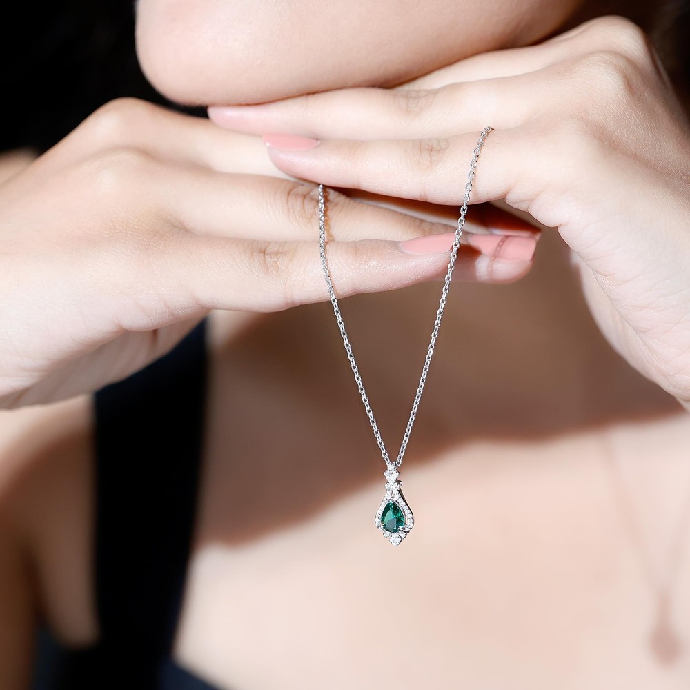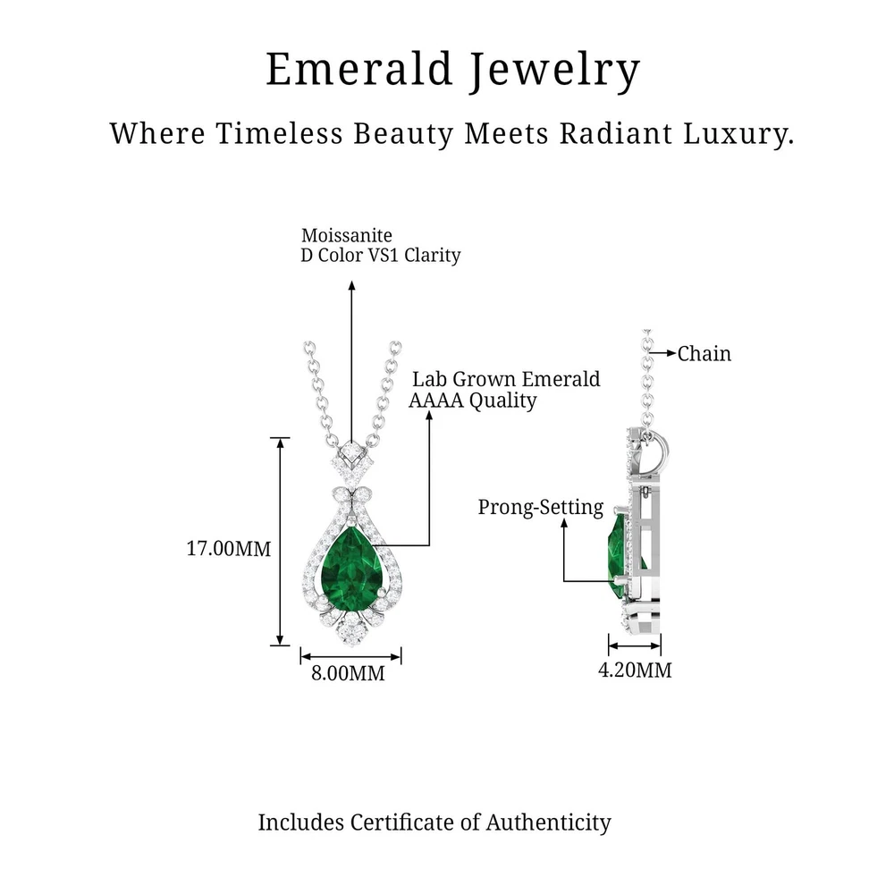 If she is an old-school aesthetic then this Lab Created Emerald Pendant Necklace is a stunning choice for her. Exuding elegance and sophistication this stunning Green Emerald Bridal Necklace has rich hue of 5X7 mm Pear Shaped Lab Created Emerald in Prong Prong Setting with brilliant cut Moissanite on the teardrop frame that beautifully dangles through an 18 inch Chain. Exquisitely crafted in Gold Plated Silver this Pear Shaped Emerald Necklace adds a touch of glamour to the outfit, capturing the light that draws attention of the onlookers. As a symbol of love and commitment this Lab Emerald May Birthstone Necklace is sure to be cherished for years to come. Having a captivating allure and symbolic meaning this Teardrop Pendant Necklace has Aaaa Quality and D-Vs1 Quality of Moissanite. Emerald lovers will adore this must-have beauty. This Pendant Necklace showcases a Pear Shape Lab Grown Emerald in prong set while petite Round Moissanite sparkles on the unique motif. This striking contrast of the gems adds a delightful charm. Experience the epitome of elegance and sophistication with our lab-grown emeralds. A flawless addition to your jewelry collection, they accentuate your unique style and illuminate your inner radiance. Our lab grown emeralds boast a mesmerizing green hue, elevating the allure of your jewelry pieces to new heights. Quality Assurance- 925 Sterling Silver; Lab Grown Emerald Quality: AAAA ; Total Lab Grown Emerald Carat : 0.70 (Approx.); Moissanite Quality: D-vs1 ; Total Moissanite Carat : 0.18 (Approx.) Safe and Secure Packaging - All of our jewelry items arrive in high-end signature jewelry pouch, ensuring they are ready for proposals/gifting purpose so that you don't have to spend any time in packing them. Shop with Confidence - assures you to get people's heads turned with our sparkling jewelry pieces which are authentically certified just for your peace of mind. sku:-RCPE012510064