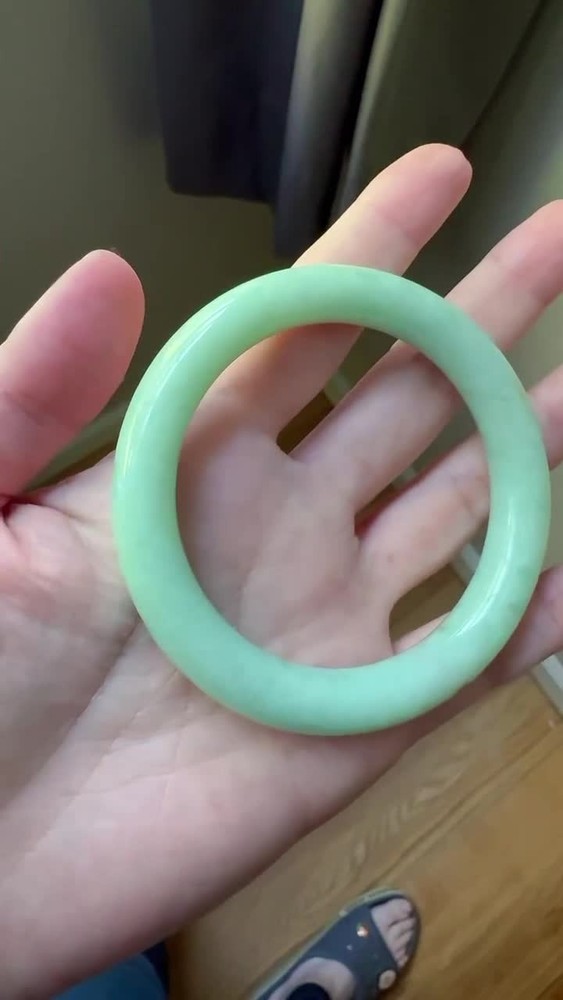 Apple green with floating specks of red, super eye catching and fine gradient 甜果绿飘红翡圆条 56.2mm inner circumference 56.2 x 10.6 x 6.8mm can be worn by someone with typical circumference of 57.5mm Barely any imperfections except small crack at the red portion Retails at $900, offers welcome!