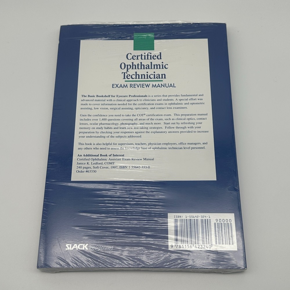 Prepare with confidence using the Certified Ophthalmic Technician Exam Review Manual by Janice K. Ledford. This comprehensive guide is the ultimate resource for mastering the COT certification exam, featuring over 1,400 questions covering clinical optics, contact lenses, pharmacology, and more. Sealed in its original shrink wrap, this brand-new copy is perfect for students, technicians, and educators looking for reliable exam preparation. Don't miss the opportunity to own this essential resource in pristine condition—your gateway to COT success!