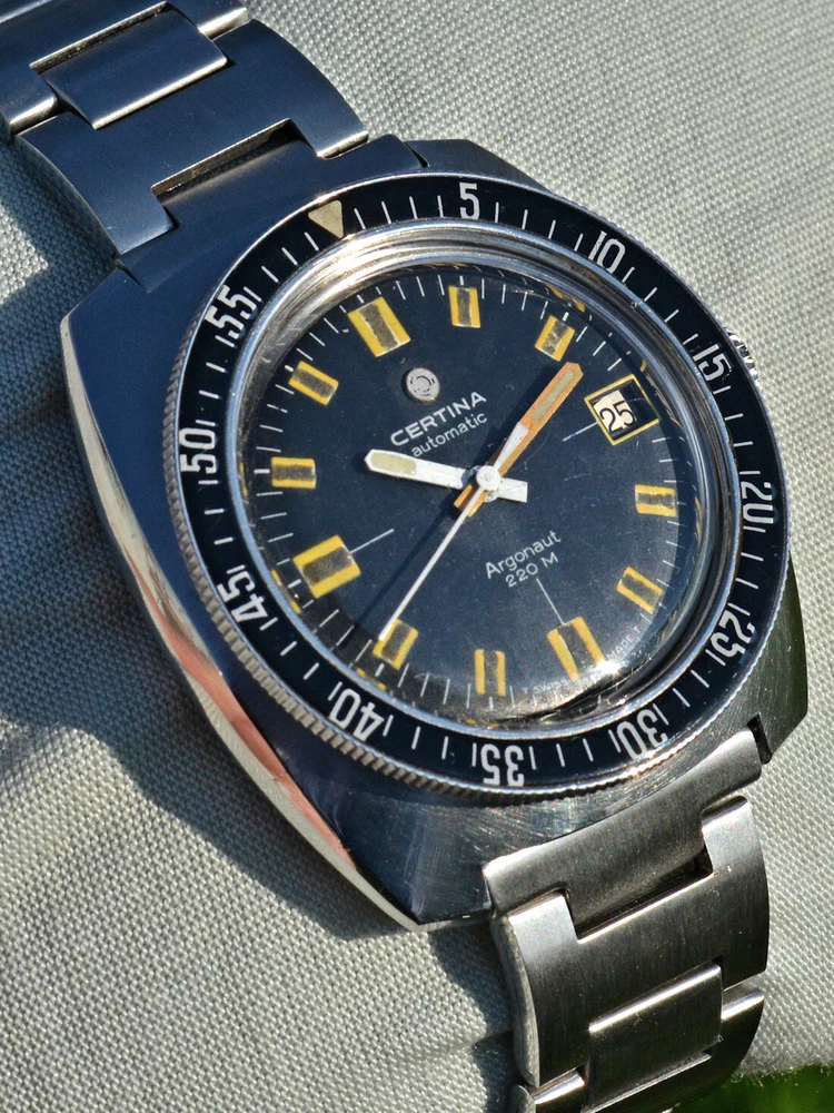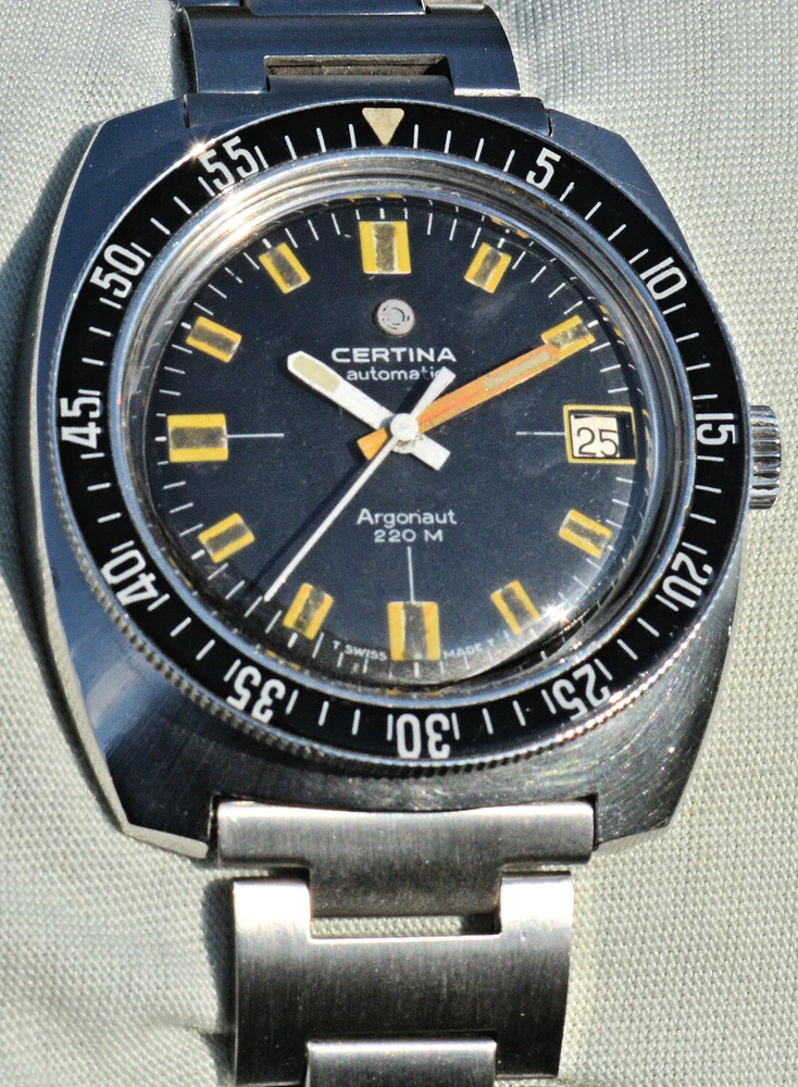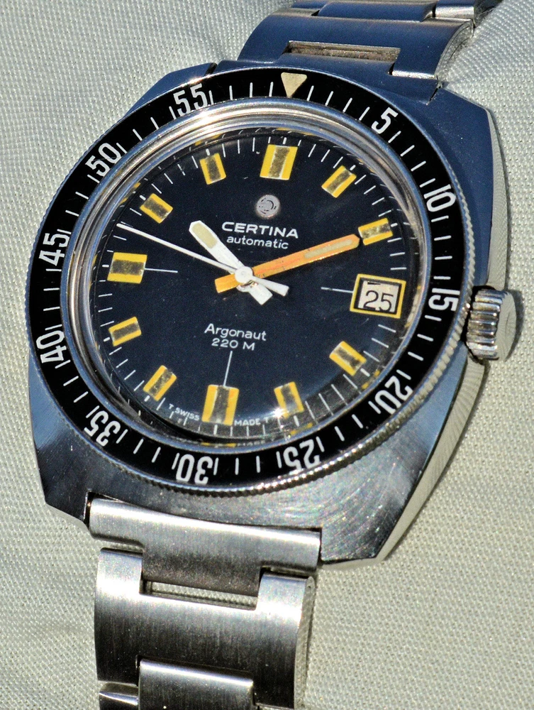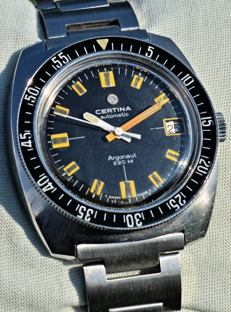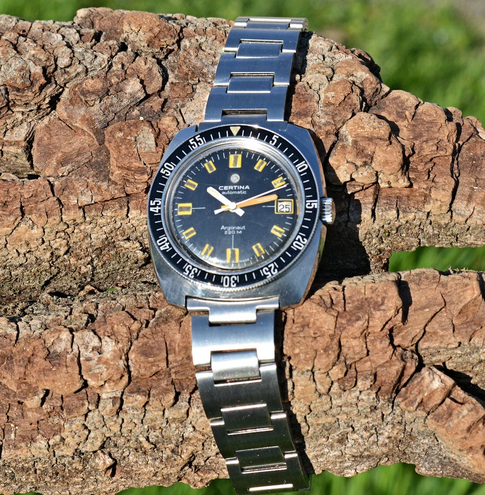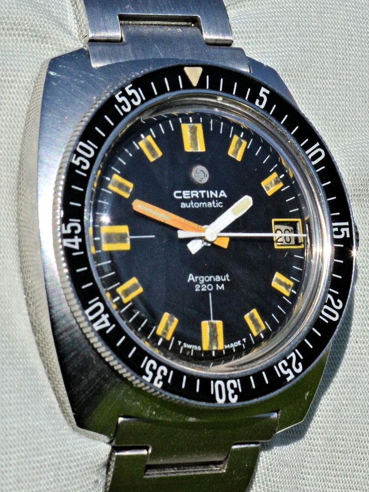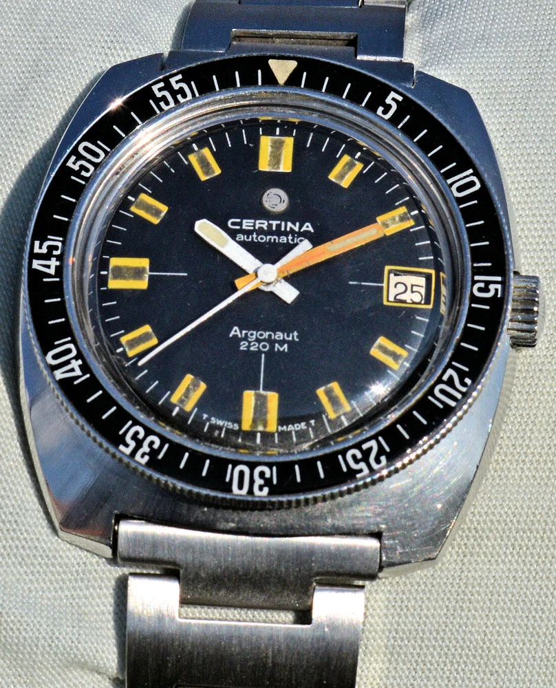Condizione 1 (ottimo) - Rarissimo orologio Certina Automatic Argonaut sub diver 220 Meters, cassa in acciaio di grandi dimensioni, rarissimo modello Sub con data della fine degli anni '60 (non conosco l'anno preciso, 1968/1970 circa), ottimamente mantenuto (nonostante abbia più di 50 anni ha solo i normali e superficiali segni dell'uso ed è ancora presente la sua satinatura originale, non è mai stato lucidato). Dimensioni cassa 42x38,5 mm. esluso la corona originale a vite , il quadrante nero non ristampato è bellissimo , è il suo originale dell'epoca, le lancette e l'indice triangolare sulla lunetta sono luminosi al buio, il vetro plastica non ha graffi, la bellissima ghiera in bakelite è girevole bidirezionale. Il movimento Certina 25-651 è pulitissimo e perfettamente funzionante (è stato revisionato da un professionista del settore in Marzo 2025, quindi rilascierò personale garanzia scritta valevole per mesi 24) . Il fondello è in acciaio a vite e garantisce una impermeabilità fino a 220 mt. Il bracciale acciaio è il suo originale dell'epoca. Garantisco la massima serietà e veridicità dell’oggetto. Le fotografie sono attuali dell'oggetto in vendita. * * * * * INTERNATIONAL BUYERS ARE WELCOME ASK FOR SHIPPING QUOTE I accept paypal payment only from verify member * * * * *