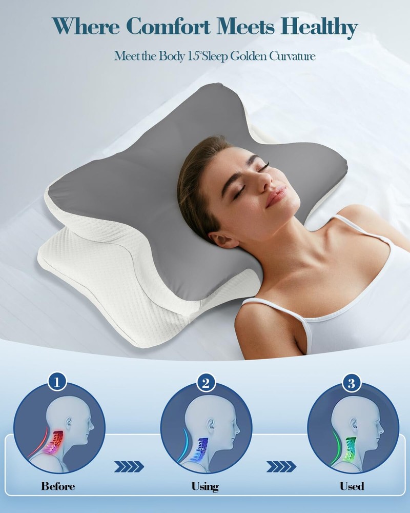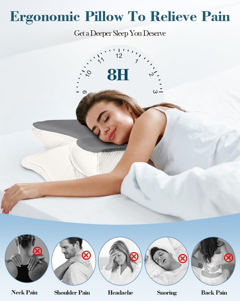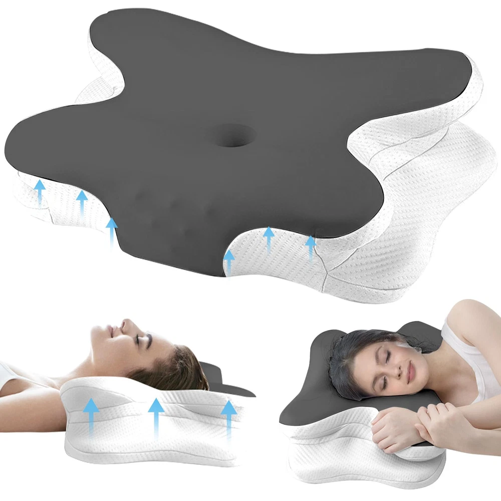 BUTTERFLY SHAPED PILLOW: Transform your sleep experience with the versatile ergonomic pillow. Its innovative design, featuring a unique hollow and butterfly curve, mimics the human anatomy to perfection. This curve molds snugly to your head, aligning your spine and relieving cervical stress. Enjoy ample shoulder space and an extended armrest area for unrestricted hand positioning. Say goodbye to discomfort and embrace restful nights with this revolutionary pillow! PERFECT FOR SIDE, BACK, STOMACH SLEEPERS: The Ergonomic Pillow comes two height options and armrest design, so you can choose personalized height. Flip it 180 degrees to switch between high and low profiles: high suits side sleepers and larger frames, low is ideal for various sleeping positions. Its sculptable design allows easy shaping for personalized support under the head and neck, ensuring comfort in any posture! SLOW REBOUND MEMORY FOAM: Our neck pillow features a unique natural molded foam crafted from premium resilient memory foam. As you rest on it, the memory foam gently adjusts, providing cloud-like comfort. Its perfect firmness and support mold seamlessly to your neck and head, guaranteeing a peaceful night's sleep COOLING BREATHABLE & REMOVABLE PILLOWCASE: This side sleeper pillow with cooling ice silk pillowcase, and there are lots of ventilation air holes at the neck and head position, which help dissipate heat and keep you cool all night. The pillowcase has a zipper on the back, you can remove it for cleaning at any time, and it's machine washable. You will not regret to purchase this super comfortable sleep pillow PERFECT GIFT CHOICE: This cervical neck pillow is designed to effectively prevent cervical spine issues and alleviate sleepless nights. Suitable for individuals of all ages, including yourself, parents, friends, and colleagues, its long-term use can significantly enhance the quality of sleep