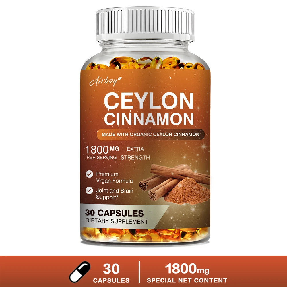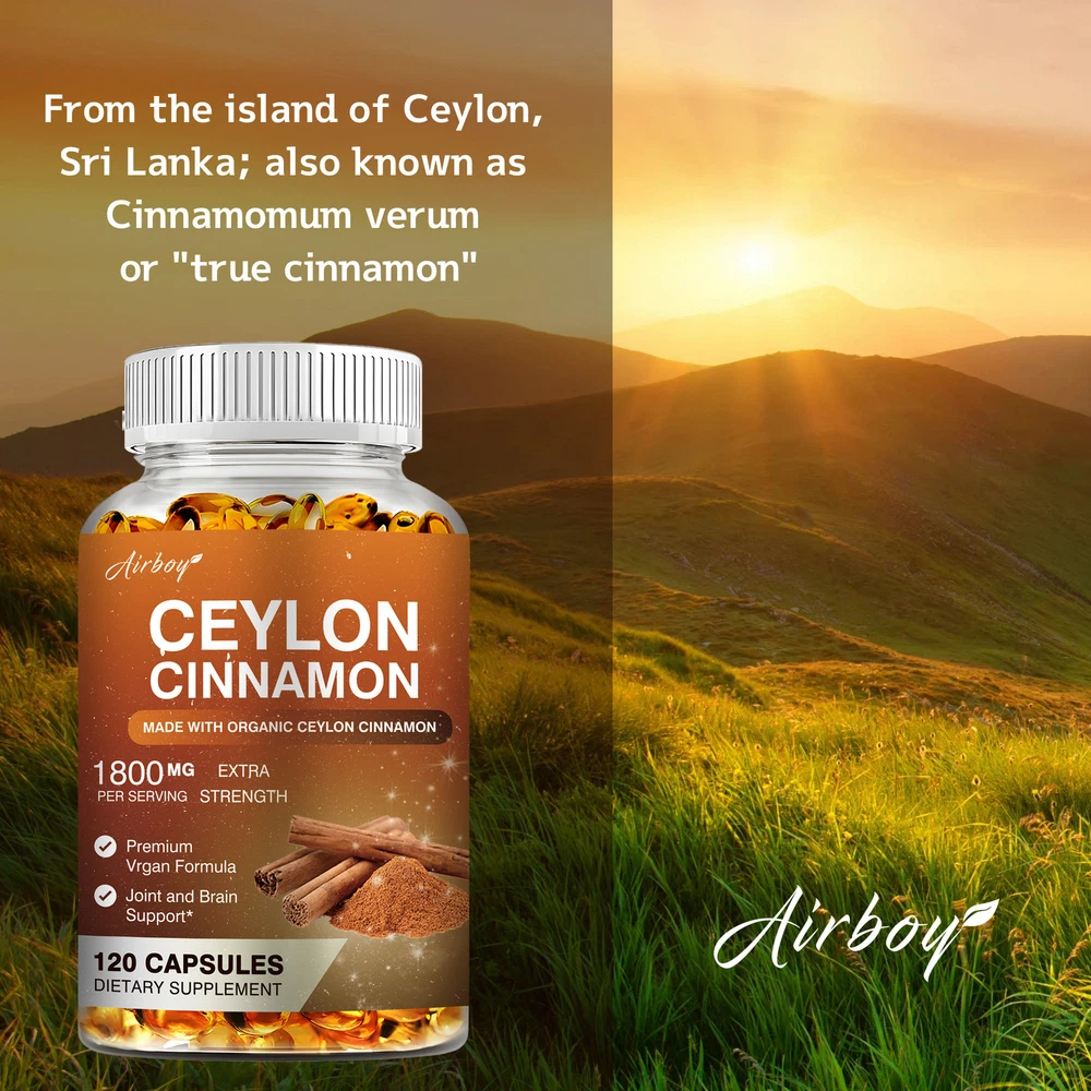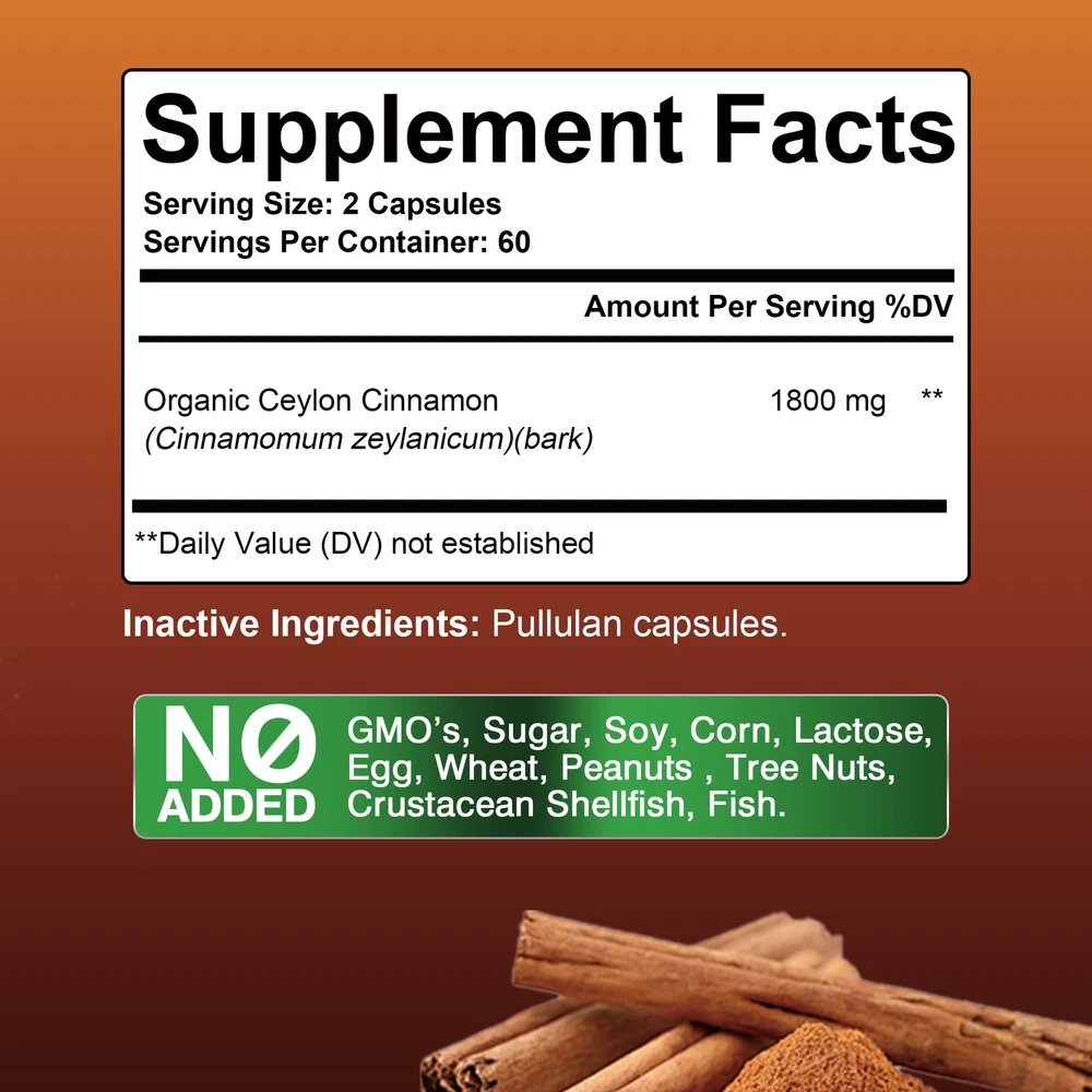Effects: Brain & Nervous System Health,Heart Health Ingredients: Organic Ceylon Cinnamon Directions: Take 2 capsules once daily after a meal. Shipping: Ships within 48 hours on working days. Shelf life: 2 years Description: Premium Ceylon Cinnamon: Ceylon Cinnamon capsules provide 1800 mg of Ceylon Cinnamon per serving. Clean Cinnamon Supplement: Ceylon Cinnamon capsules contain only Ceylon Cinnamon, without additives or dyes, for maximum benefits. Powerful Antioxidant: Cinnamon is rich in polyphenols; natural antioxidants that provide heart support and brain support. Document