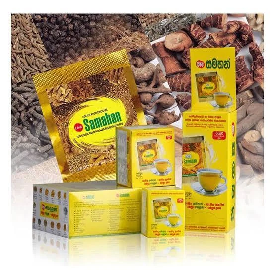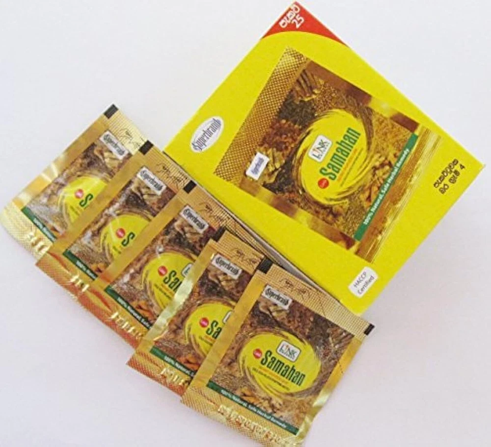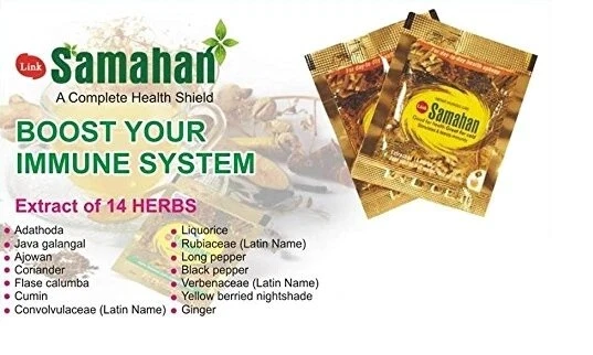 Ceylon Link SAMAHAN Ayurveda Herbal Tea Natural Drink for Cough & Cold Remedy Link Samahan 100% Natural herbal Instant Ayurveda Tea 4g each Packet Available in 4gx 10-100 packets Item description from the seller:- Link Samahan is a 100% natural authentic herbal drink formulated with 14 trusted ayurvedic herbal ingredients that have been used traditionally over centuries to enhance health & well-being. Link Samahan has been trusted for over two decades by millions of consumers who consume the product daily. Its unique aroma and pleasant zesty taste are loved by consumers around the world. It is a very concentrated herbal preparation in the form of a powder, which is diluted with water. After drinking, there is an immediate supply of energy. For flu and colds, it relieves upper respiratory tract pain. It is a concentrated, water-soluble formulation that has a preventive effect on signs of the common cold and flu. It acts as an analgesic (pain reliever), antipyretic (fever reducer), expectorant (promotes sputum secretion), and anti-inflammatory, thus providing immediate relief from the first signs of a cold. Samahan provides a complete Health Shield if consumed daily. Samahan can be added with Tea, milk, Soup's or plain old method of consuming it with hot water. Ingredients:- Adhatoda-Adhatoda vasica Nees. Galangal- Alpinia galanga Willd. Ajowan – Carum copticum Benth & Hook Coriander – Coriandrum sativum Linn. Veniwel – Coscinium fenestratum (Gaertn.) Colebr. Cumin – Cuminum cyminum Linn. Vishnukranthi- Evolvulus alsinoides Linn. Liquorice – Glycyrrhiza glabra Linn. Pathpadagam- Hedyotis herbaceae (Linn.) Lam. Long pepper- Piper longum Linn. Black pepper- Piper nigrum Linn. Siritekku- Premna herbacea Roxb. Katuwelbatu- Solanum xanthocarpum Schrade. & Wendl. Ginger- Zingiber officinale Roscoe. 1. What is Samahan? Samahan is a 100% herbal preparation based on Ayurveda principles. It contains the extracts of 14 herbs mentioned in the sachet, only.The formula was developed by a panel of Ayurveda practitioners. The formula was developed after 5 years of Research and Development by a multi-disciplinary team of scientists, technologists and Ayurveda practitioners at Link Natural. 2. What's so special about Samahan? Samahan is the first Ayurvedi 100% herbal easy-to-use preparation in the market for colds and cold related symptoms and Flu. 3. When should Samahan be taken? Samahan can be taken at any time. It is most effective when taken at the first sign of cold or flu. 4. Can Samahan be taken while on other medication? Yes. Most ingredients in Samahan are commonly used in our day-to-day food.According to the panel of Ayurveda practitioners who developed the Samahan formula, it could be taken while on other medication. 5. If its an Ayurvedic formulation, how can it be instant and so effective? Ayurveda is a medical system that is in existence for over 5000 years and used by millions of people. Samahan formula was developed based on Ayurvedic principles and experience.The use of authentic raw materials of right quality and the scientifically optimized production protocol by Link Natural, make the Samahan effective and instant. 6. Samahan is said to act instantly. How is that? Answered in (5) above. 7. Are "Western drugs" added to give Samahan the quick-fix effect? NO. Samahan is 100% natural. It contains only the ingredients mentioned in the pack and cane sugar. 8. Is Samahan good only for cold and cold-related ailments? Samahan is especially prepared for cold and cold related symptoms and flu but, is effective for fatigue, body aches and similar common complaints. 9. Can Samahan be taken regularly? Yes. It can be taken as a normal warm drink. It can be taken with tea or coffee, or could even replace them. 10. Will it have side effects if taken daily? No. Ingredients of Samahan had been in use for centuries for food and medicine, without any side effects.