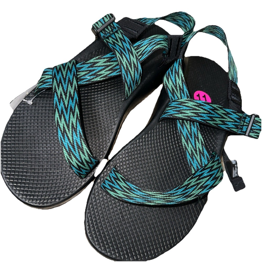 The Chaco JCH108685 Men's Strappy Green Black Blue Adjustable Hiking Sandals are a versatile and stylish option for outdoor activities and casual wear. Featuring a geometric blue pattern with the Chaco logo accent, these sandals are designed for comfort with arch support and an adjustable ankle strap. Made with a textile upper and a rubber outsole, they are perfect for summer, fall, and spring adventures. The strappy style and durable construction make these sandals a reliable choice for travel and active pursuits. Please check photos for more details. (Ref #14 green tub sandal /11)