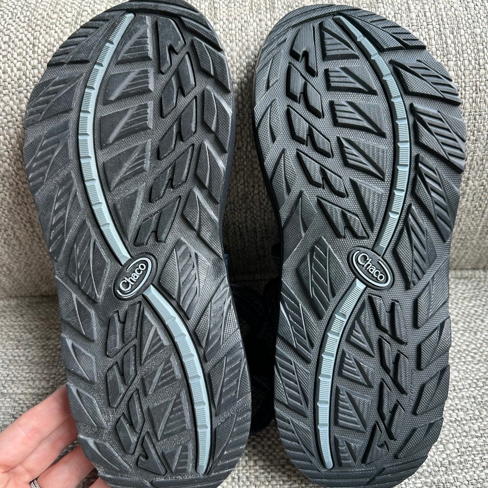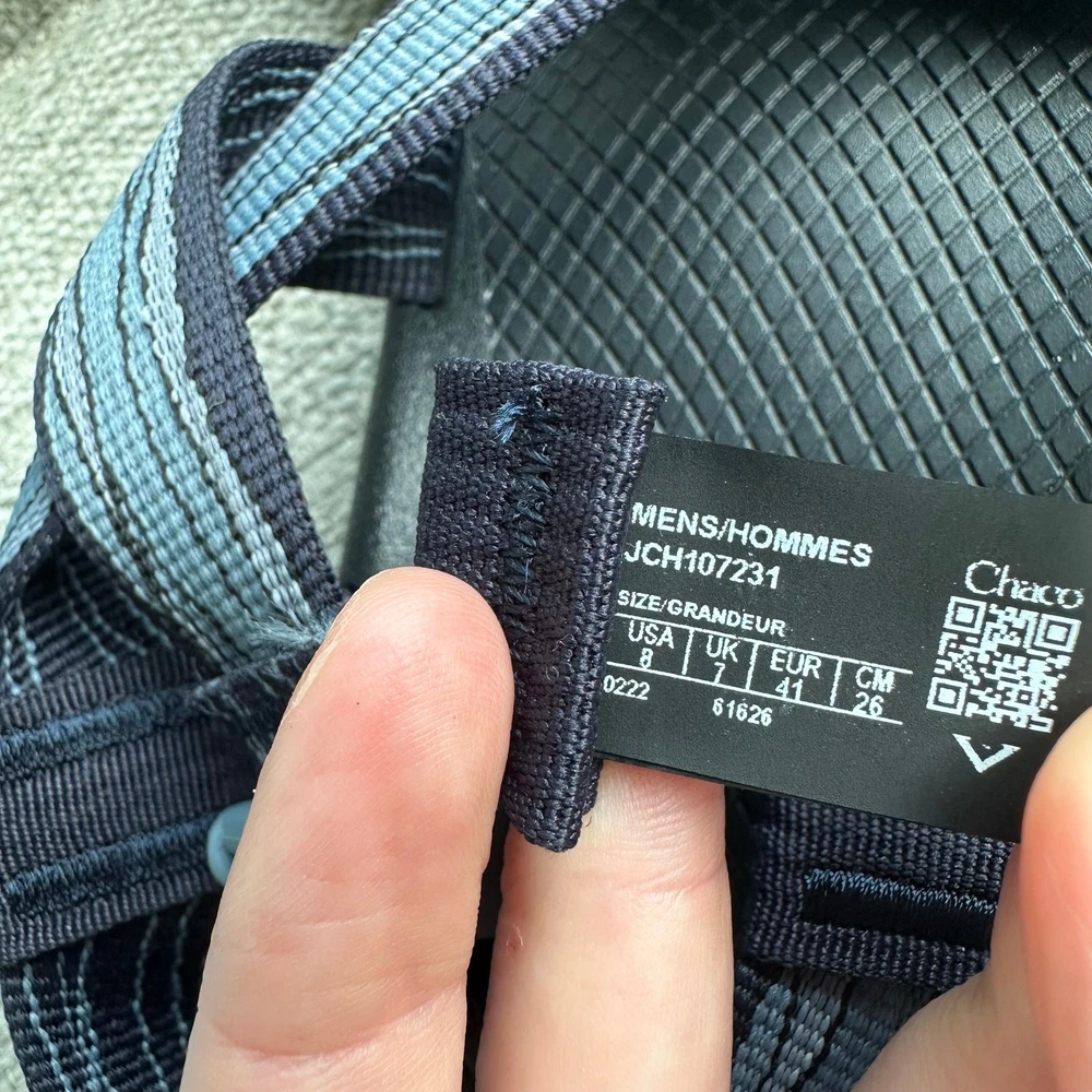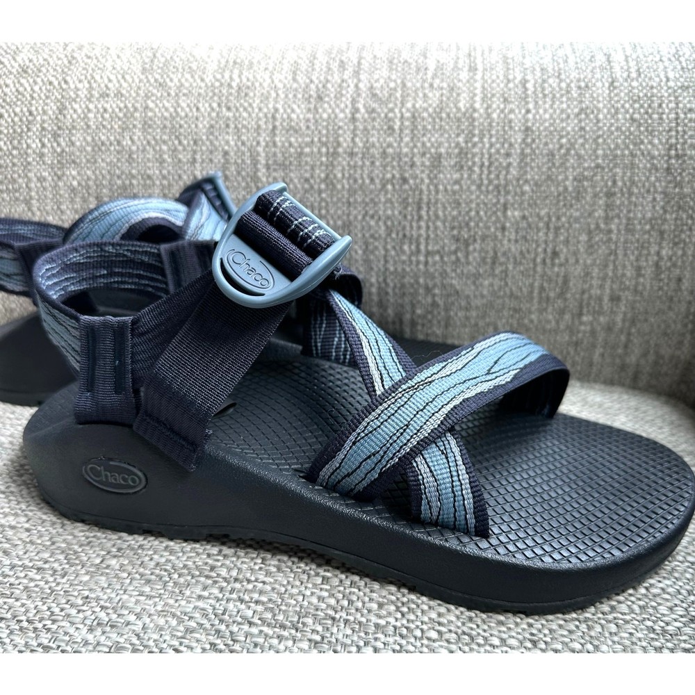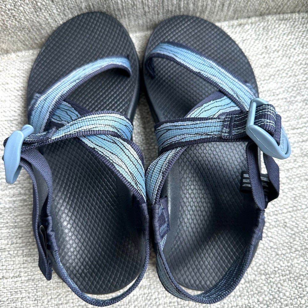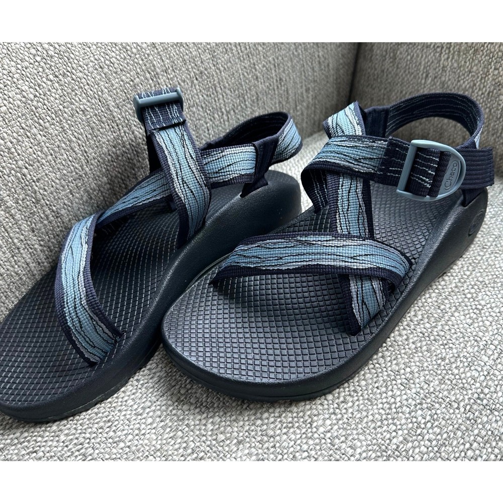 CHACO Z/1 Classic Sandals Black soles with blue design fabric straps Fully adjustable for customized fit Great for all day wear, hiking, long walks, etc. Men's Size 8 In excellent condition - these were maybe worn once