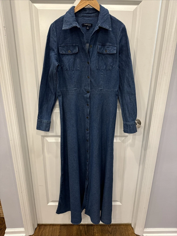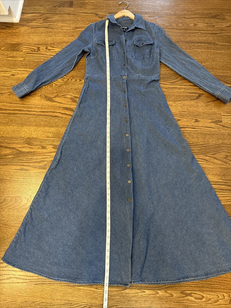 This Chadwicks of Boston blue denim dress is a timeless piece that will fit seamlessly into your wardrobe. The dress features a collared neckline, long sleeves, and a button front closure, making it suitable for a variety of occasions including travel, casual outings, and workwear. The dress is made of high-quality cotton material and has a solid pattern, making it a versatile addition to your wardrobe. The dress is a size 8 and has a long 54” length, perfect for any season including summer, fall, and spring. The dress has a Western, peasant, or 90s theme, adding a touch of uniqueness to your outfit. The skirt is cut on the bias. This shirt dress is a must-have for any fashion-forward woman and is sure to make a statement wherever you go.