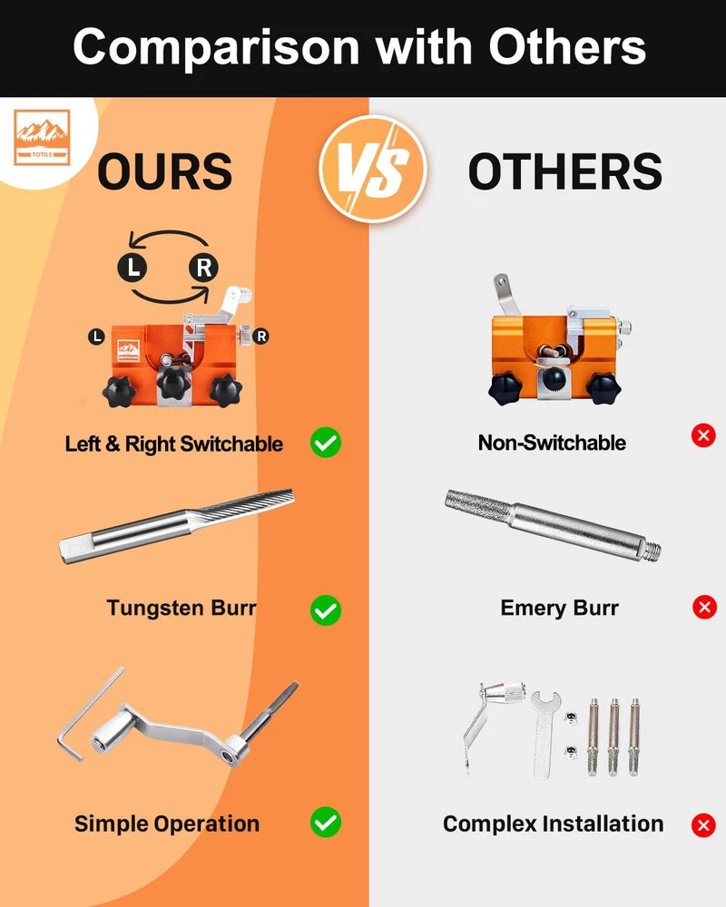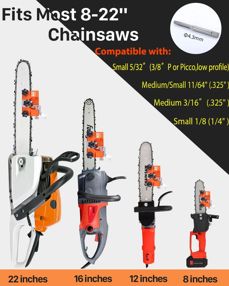 【Tungsten Carbide Cutter】 The set comes with 1 pcs 4.3mmTungsten Carbide Cutter for Medium/Small 11/64" (.325" ) ,also Compatible with Small 5/32″(3/8″ P or Picco,low profile) ,Medium 3/16″(.325″),Extra Small 1/8 (1/4″ ) Pitch Chains. 【Sturdy Material】Chainsaw chain sharpener is made of anodized aluminum fixture, which is not easy to rust. The tungsten steel grinding head is made of tungsten carbide, which is strong and durable, sharper than the hard steel file, and has a longer service life. 【Clever Design】This is the latest version of Chainsaw chain sharpening jig, Two fixed sharpening holes and a standard 30 °sharpening front angle, you can switch to use on both sides, can be applied to more complex environments and saving your time. 【Simple Installation】Chainsaw sharpener jig can be switched on both sides, just fix the clip on the rod, insert the burr into one of the guide sleeve, you can also switch to the other sleeve, turn the handle, only 3-5 seconds will be blunt chain back to sharp as new. 【Satisfactory Service】Chain Saw Shaperener tool package contains 1 brush, 1 pair of gloves. 1 manual, 1 tungsten carbide sharpening rod, a hexagonal wrench, if you have any questions about the product, please contact us promptly, we reply within 24 hours.