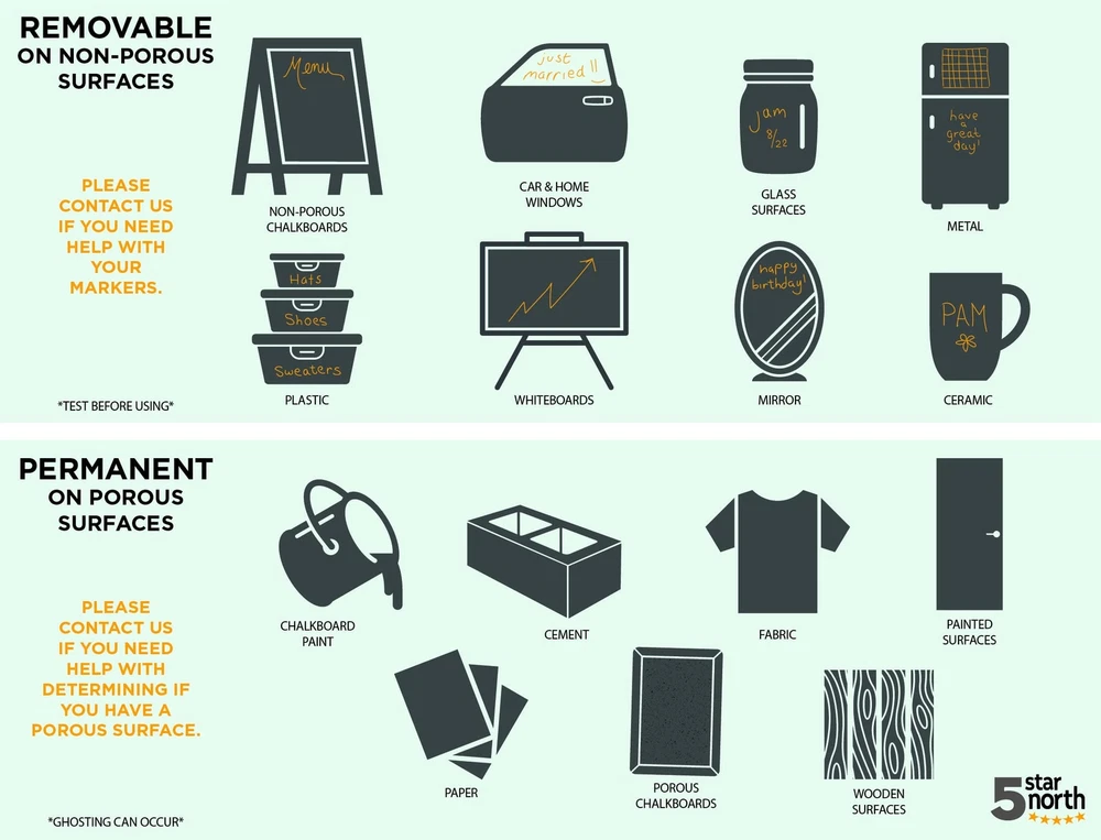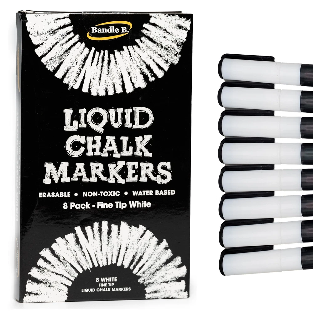 IMPORTANT! - NEVER use any chalk markers on chalkboard paint or low-quality porous chalkboards. Test in a corner first. WRITE ON ANY PRIMED CHALKBOARD, GLASS OR OTHER NON POROUS SURFACE. These chalkboard markers also make great window markers and dry erase markers! Use these chalk markers for glass, tile, contact paper, stickers, whiteboards, plastic, and metal with ease. The bright liquid chalk is sure to please. Bring Your Creativity to Life! Perfect for hand lettering and freestyle designs, Bandle B. White Fine Tip Liquid Chalk Markers help your designs, messages, and slogans pop off of chalkboards or whiteboards. These markers are easy to use and erase. Perfect for any Occasion. Looking for a way to write out directions or say something you want everyone to read? The Bandle B. Liquid Chalk Markers are the perfect way to do it. For use in your home or business, the bright white color creates eye-catching designs on your writing surface to make a lasting impact. It's all in the Details. Each Bandle B. fine tip chalk marker makes it easy to create accurate, smooth lines. The fine point makes smooth and precise details. Perfect for accenting neon, vintage, pastel, and other color markers. Full One-Year 5-Star Manufacturer Warranty; That’s right, the manufacturer stands behind these liquid chalk markers. Refund or replacement for one full year, (US Only).