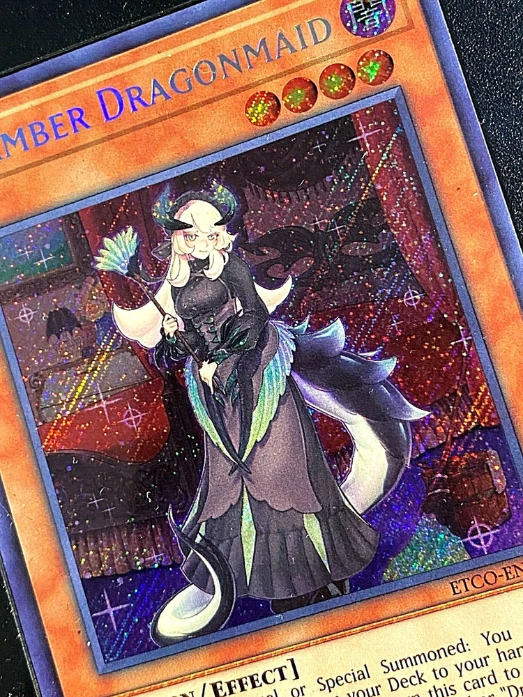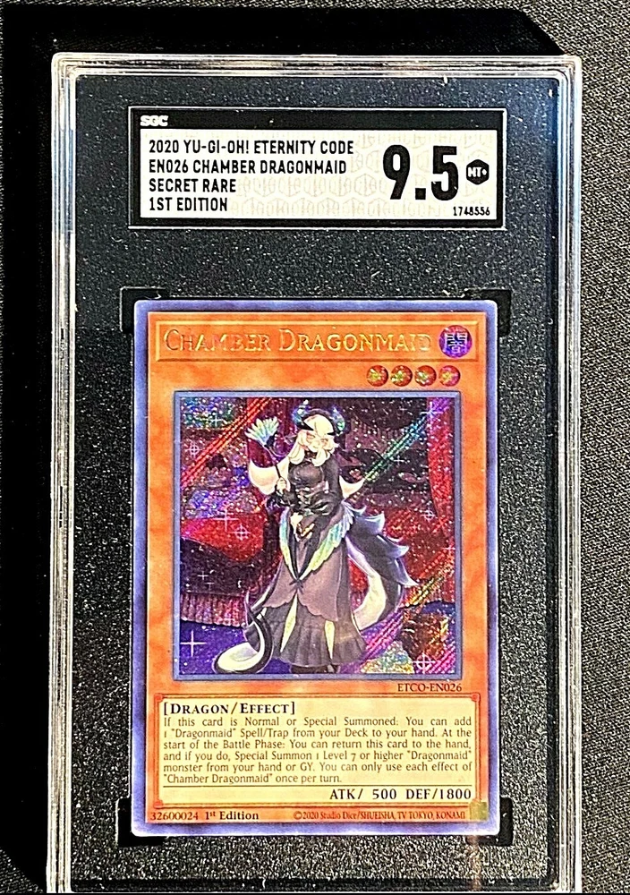 Language:EnglishCard Number:ETCO-EN026Features:1st EditionAdditional Description:Chamber DragonmaidLevel:4Game:Yu-Gi-Oh! TCGCard Text:If this card is Normal or Special Summoned: You can add 1 "Dragonmaid" Spell/Trap from your Deck to your hand. At the start of the Battle Phase: You can return this card to the hand, and if you do, Special Summon 1 Level 7 or higher "Dragonmaid" monster from your hand or GY. You can only use each effect of "Chamber Dragonmaid" once per turn.Attack/Power:500Card Type:Effectbrand:KonamiAttribute/MTG:Color:DarkRarity:Secret RareSet:Eternity CodeCreature/Monster Type:DragonCard Name:Chamber DragonmaidDefense/Toughness:1800Manufacturer:Konami