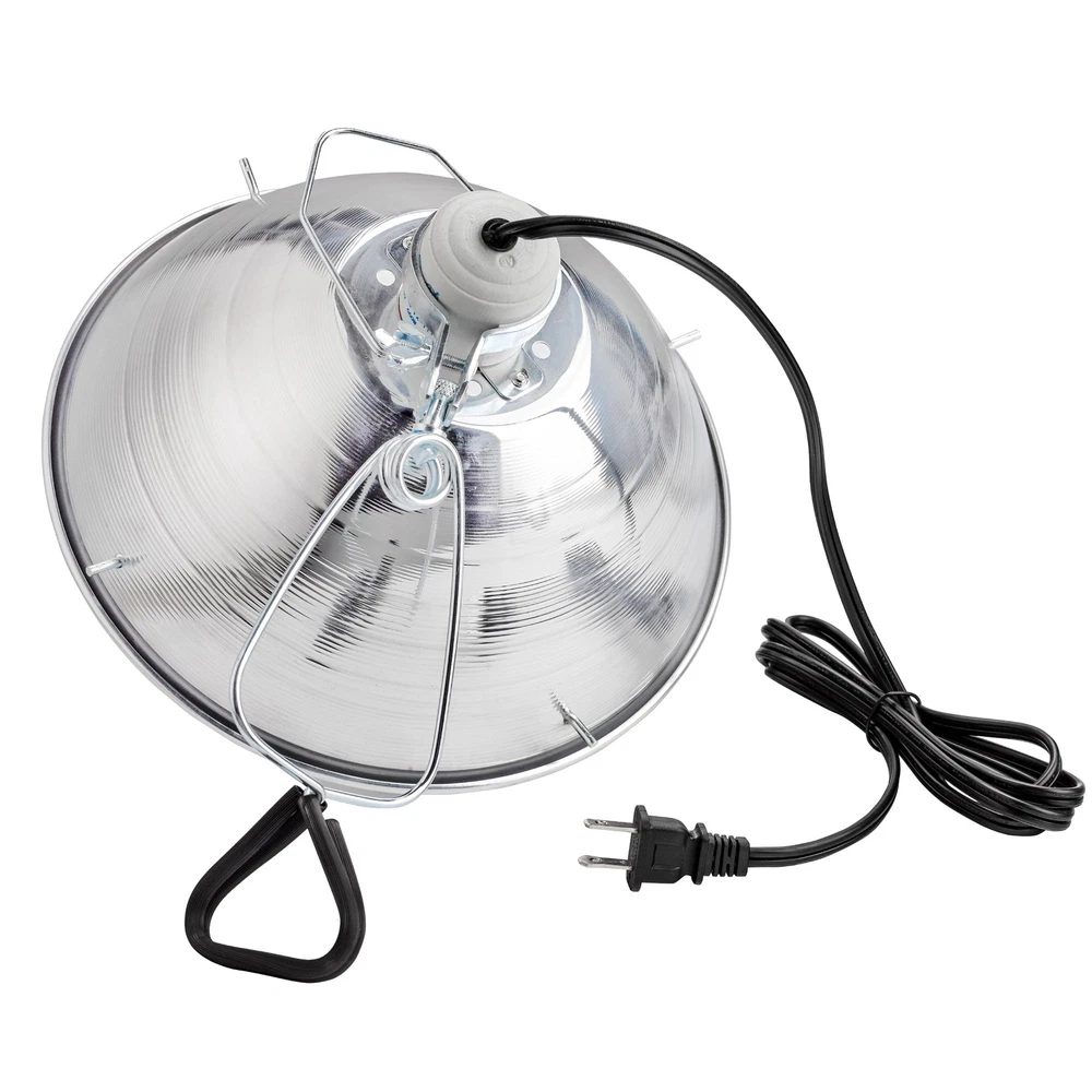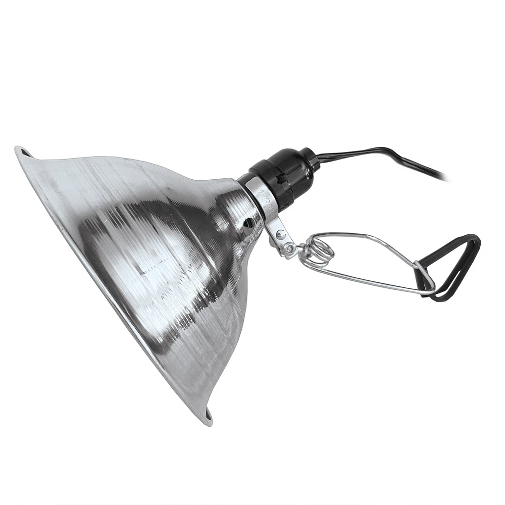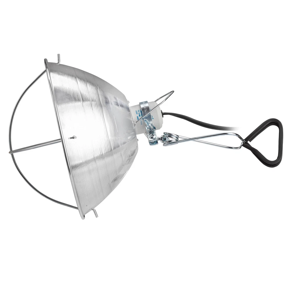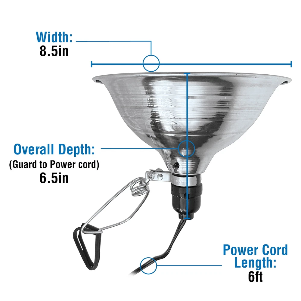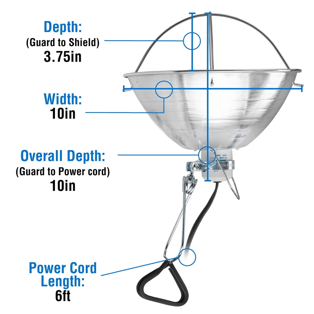 The Champion Electronics Aluminum Clamp Light is designed for halogen, incandescent, and LED bulbs up to 300 watts maximum and includes a protective front guard, making it perfect for use as a heat lamp, brooding fixture, or anywhere higher wattage bulbs are needed. No bulb is included, allowing you to choose the best light for your application. The clamp light has a 10" silver aluminum reflector and is a perfect tool for your garage, barn, workshop, attic, or anywhere portable light is needed. The adjustable base of the steel spring clamp allows the light to rotate 360 degrees making it easy to put the light where you need it most. In addition, the porcelain socket accepts standard medium base bulbs(e12) and includes a 6 foot power cord. A vinyl sleeve covers the clamp surface to secure the light and provide scratch resistance to most surfaces. Do not use in the presence of flammable or combustible material or Hazardous Locations. For Dry Indoor Use Only. 10” Champion Electronics Aluminum Reflector for Use with LED, Halogen, or Incandescent bulbs Porcelain Medium Base Socket for High Wattage and Heat Applications Spring Steel Adjustable Clamp Allows 360 Rotation Vinyl Coated Clamp Surface Designed for Scratch Resistance Base Type: Standard - Medium (E26) 300-Watt Maximum Bulb Rating (not included) Material: Aluminum shield, Steel Clamp Dimensions:10"" x 10" x 12" Cord Length: 6FT Color: Silver Quantity: 1